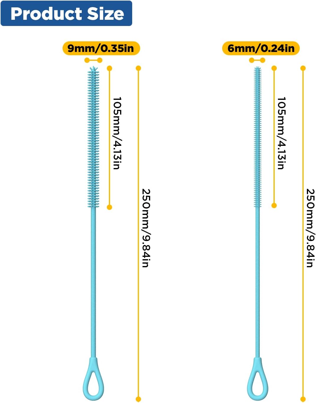 • >Multi Size: The set includes two diameters silicone straw brush, the length is 250mm, the diameters are 6mm and 9mm, and the brush head part is lengthened to 100mm, due to its extra long and soft design, it can easily brush the bottom of all kinds of straws, and it can clean every part of the straws to achieve a thorough cleaning effect.