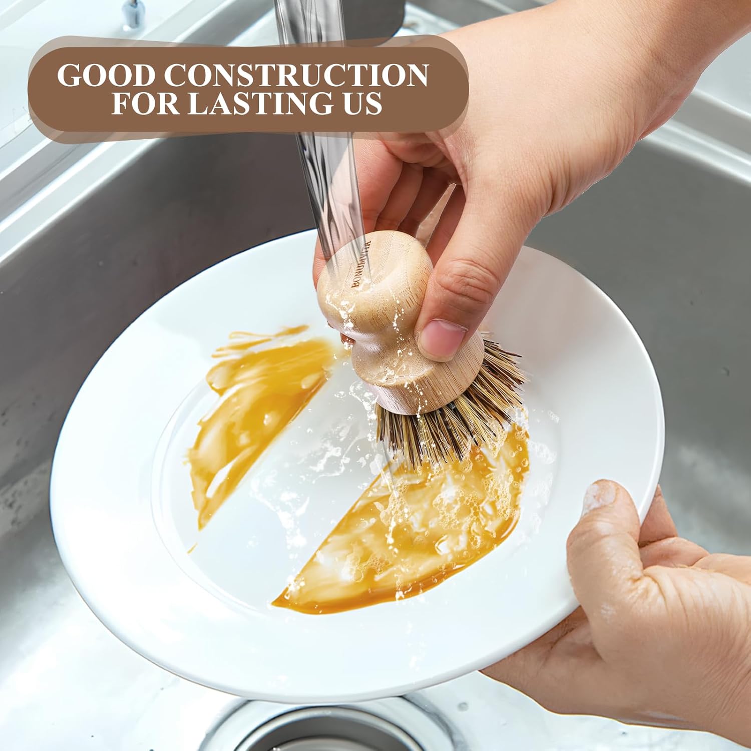 • NATURAL MATERIAL: With bamboo handle,the bristles made from a blend of palm fibers and sisal, good for scrubbing grease and grime from kitchen dishes