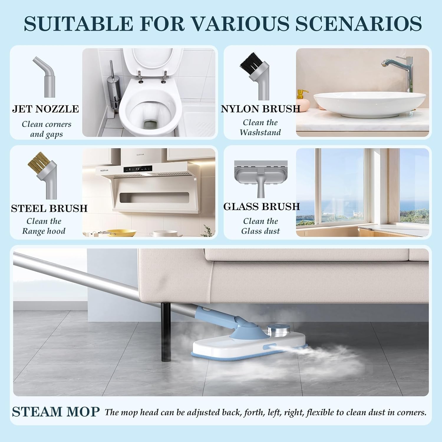 - MULTIPURPOSE HANDHELD STEAM CLEANER: What you will get is not only a mop, but also diverse tools for daily use. This detachable handheld cleaner and its attachments conveniently allow you to target hard-to-reach areas for a thorough cleaning experience