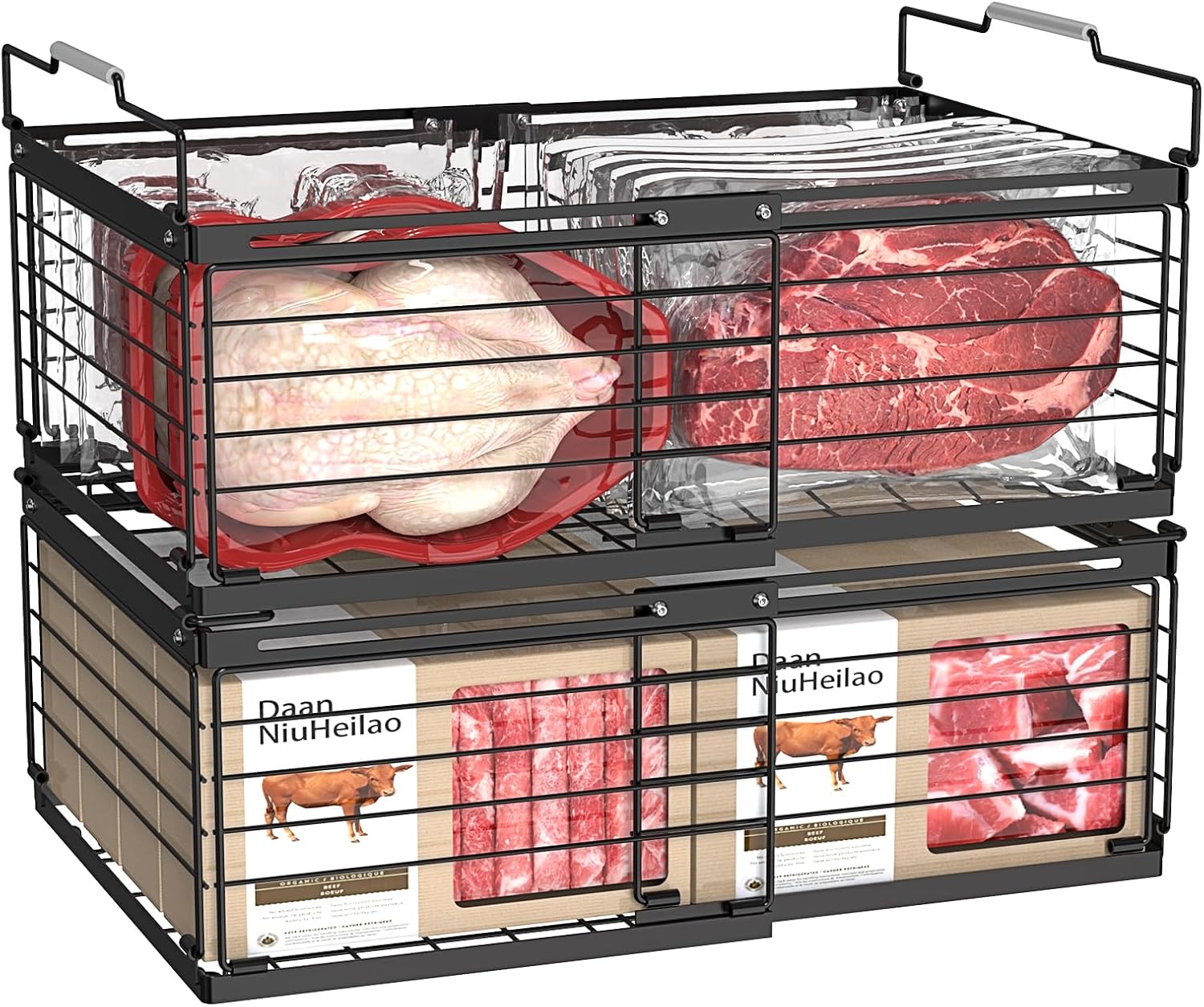 NADAMOO Freezer Organizer Bins, 2 Packs Large Expandable Stackable Chest Freezer Containers with Handle, Metal Adjustable Storage Baskets for Fridge, Deep Freezer, Cabinet, Kitchen, Pantry - Black