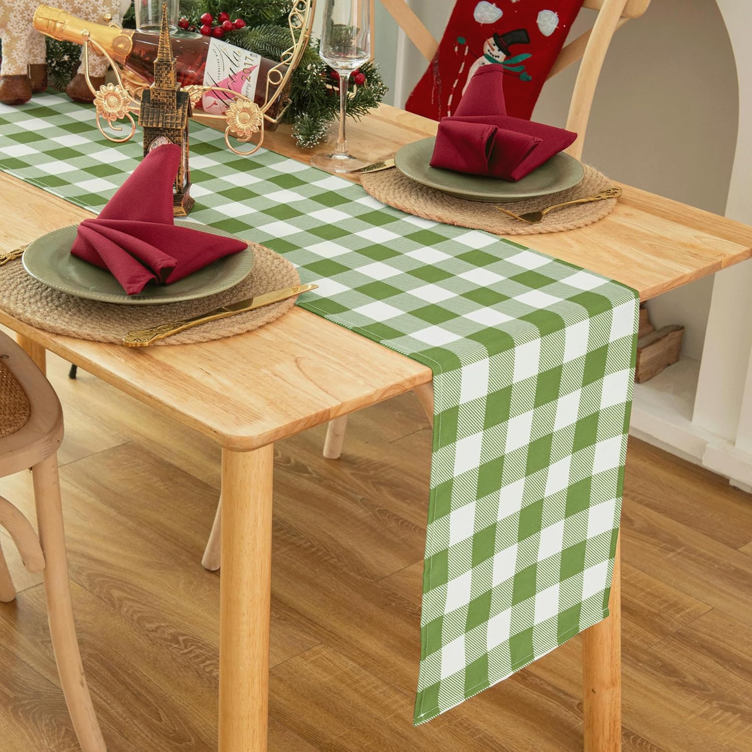 • CLASSIC GINGHAM CHECKERED DESIGN: Our checked table runner features a pattern of small, evenly spaced checks in two contrasting colors, often white and another color. The classic gingham plaid pattern for table cloth is a timeless and versatile choice