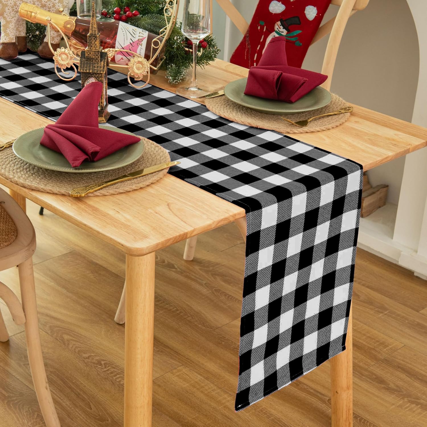 • CLASSIC GINGHAM CHECKERED DESIGN: Our checked table runner features a pattern of small, evenly spaced checks in two contrasting colors, often white and another color. The classic gingham plaid pattern for table cloth is a timeless and versatile choice