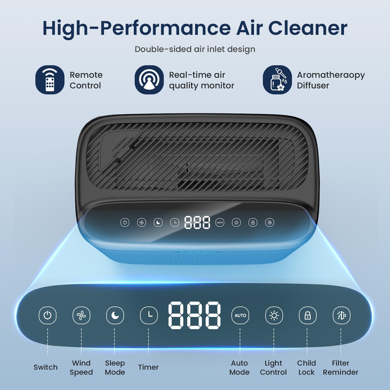 - 𝐀𝐝𝐯𝐚𝐧𝐜𝐞𝐝 𝐇𝐢𝐠𝐡-𝐄𝐟𝐟𝐢𝐜𝐢𝐞𝐧𝐜𝐲 𝐃𝐨𝐮𝐛𝐥𝐞-𝐒𝐢𝐝𝐞𝐝 𝐀𝐢𝐫 𝐏𝐮𝐫𝐢𝐟𝐢𝐞𝐫: This HEPA air purifier features a dual-sided air intake design, enabling simultaneous purification from both sides. Compared to traditional single-intake models, this innovative configuration significantly boosts purification speed and efficiency, ensuring cleaner air in less time