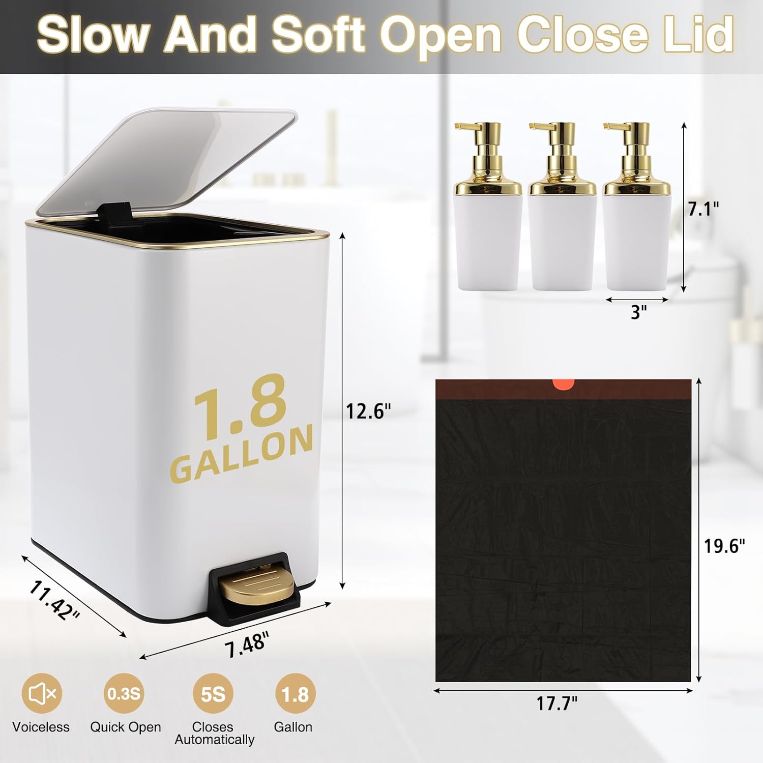 Small Bathroom Trash Can with Lid Soft Close, 1.8 Gallon Stainless Steel Garbage Can with Removable Inner Bucket,3PCS Soap Dispenser,75Count Trash Bag, Slim Step Pedal Trash Bins