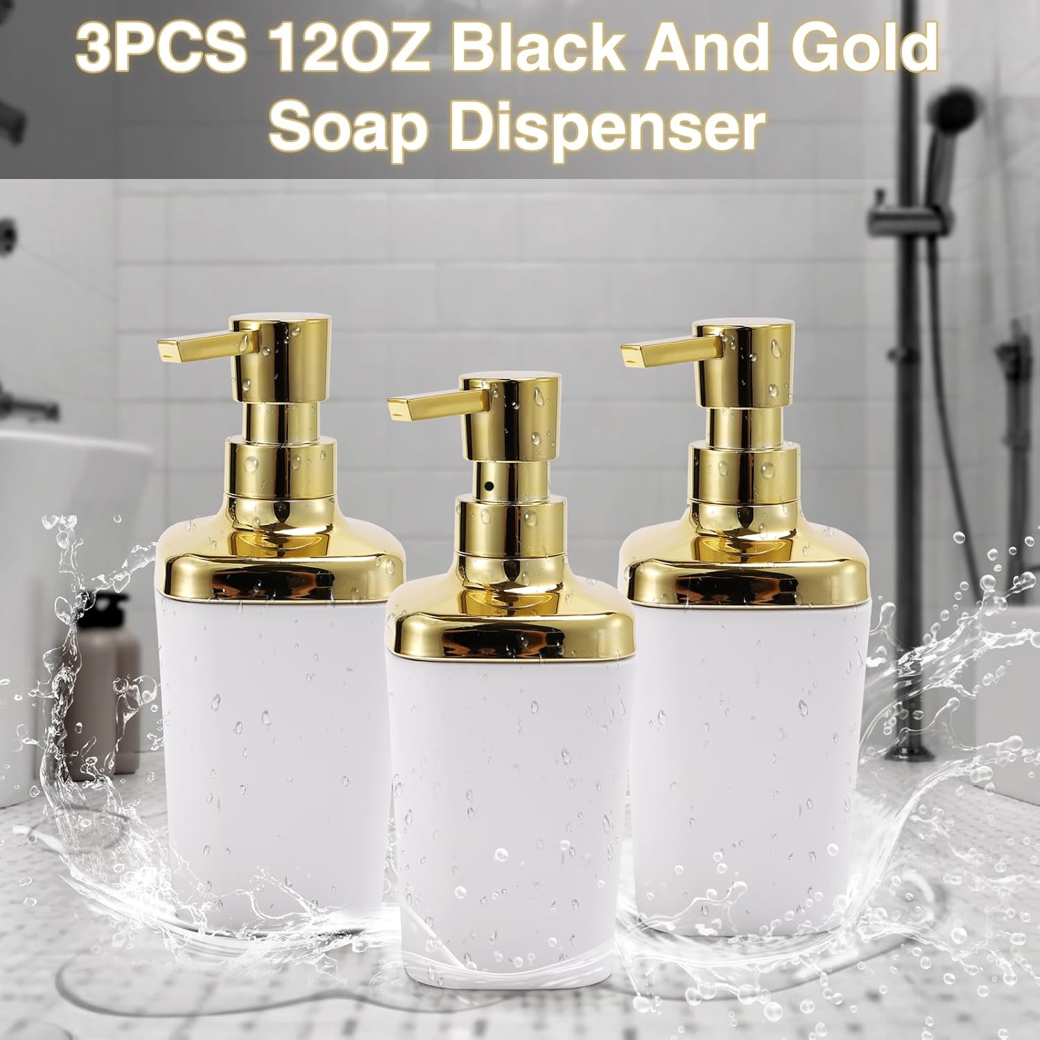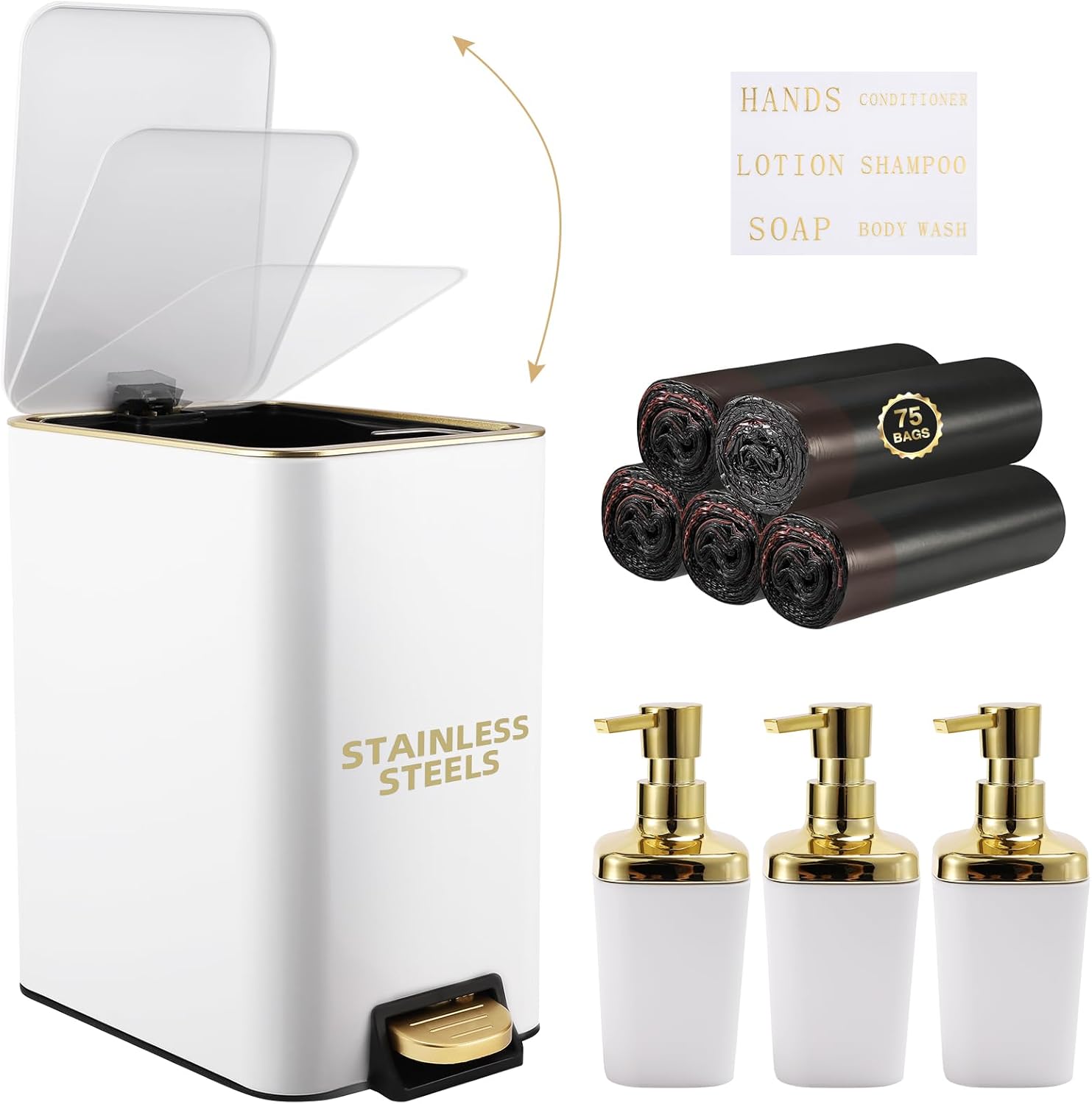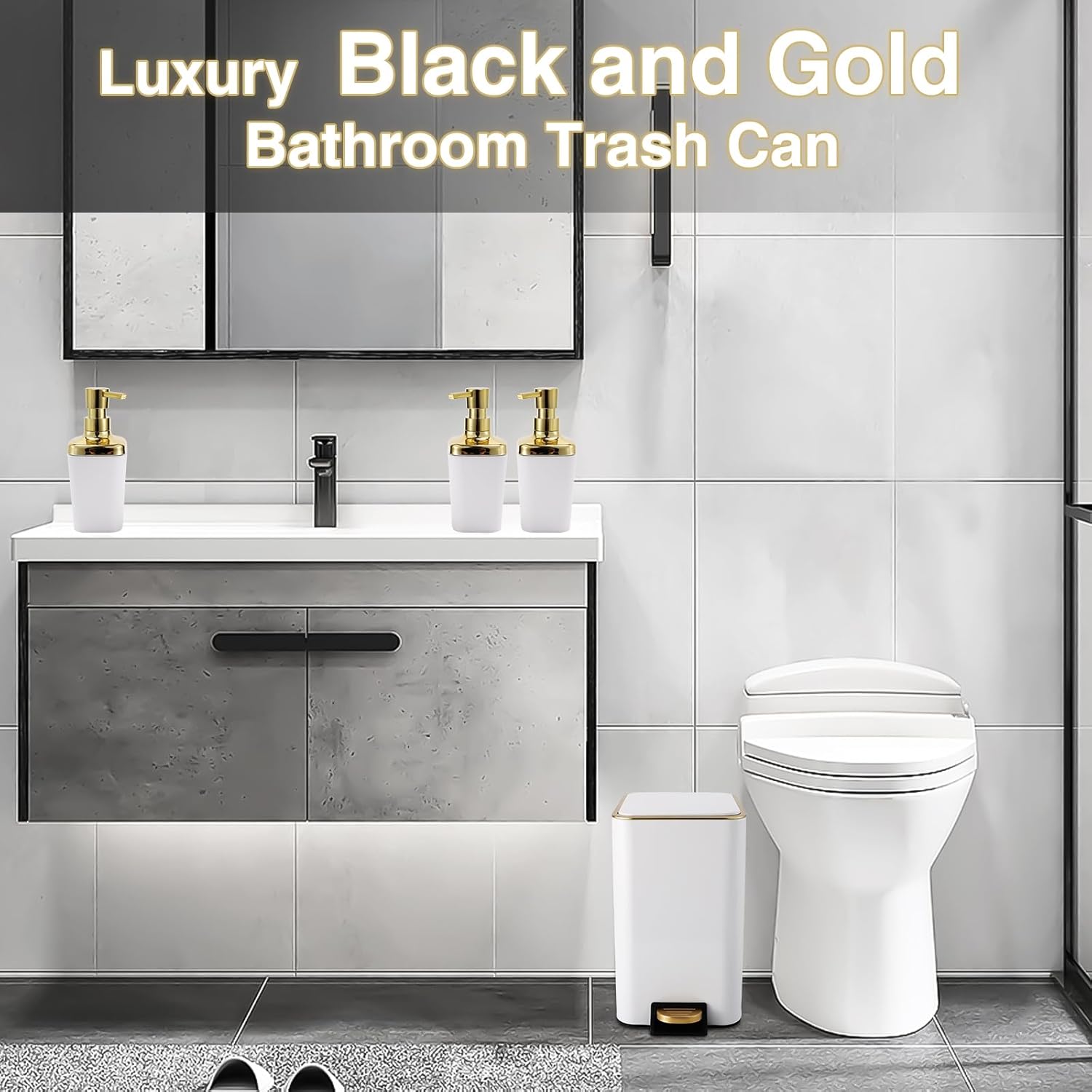 • [Package Included]:Trash can,3PCS Soap Dispenser,75 Count 5 Gallon Trash Bag,6 Waterproof Tags. each accessory is carefully selected to meet your daily needs.Our black and gold bathroom set is not only practical but also beautiful, making your bathroom space more neat and comfortable