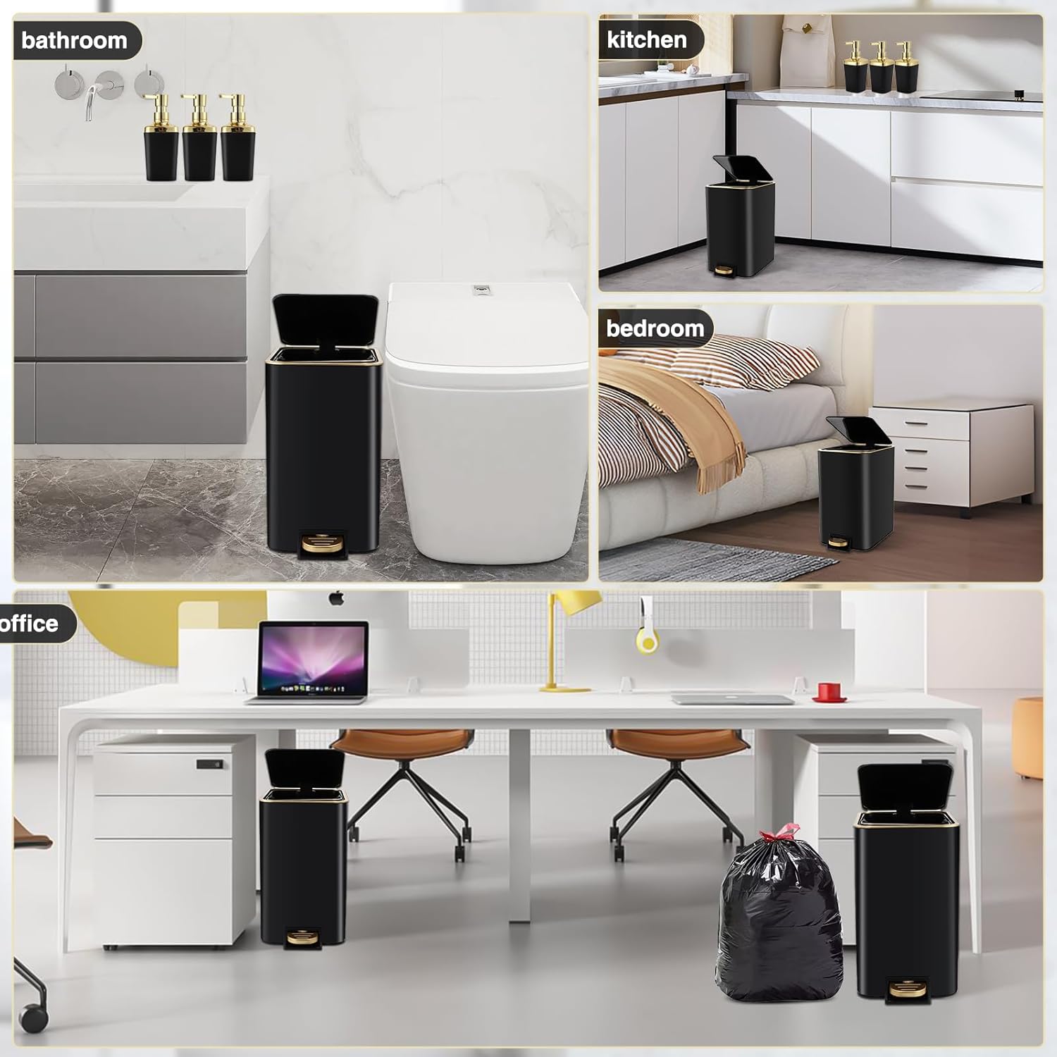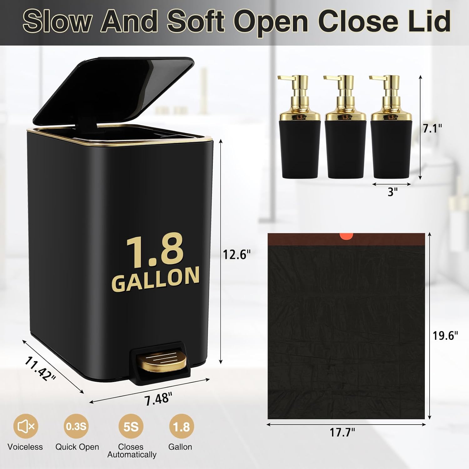 • [Package Included]:Trash can,3PCS Soap Dispenser,75 Count 5 Gallon Trash Bag,6 Waterproof Tags. each accessory is carefully selected to meet your daily needs.Our black and gold bathroom set is not only practical but also beautiful, making your bathroom space more neat and comfortable