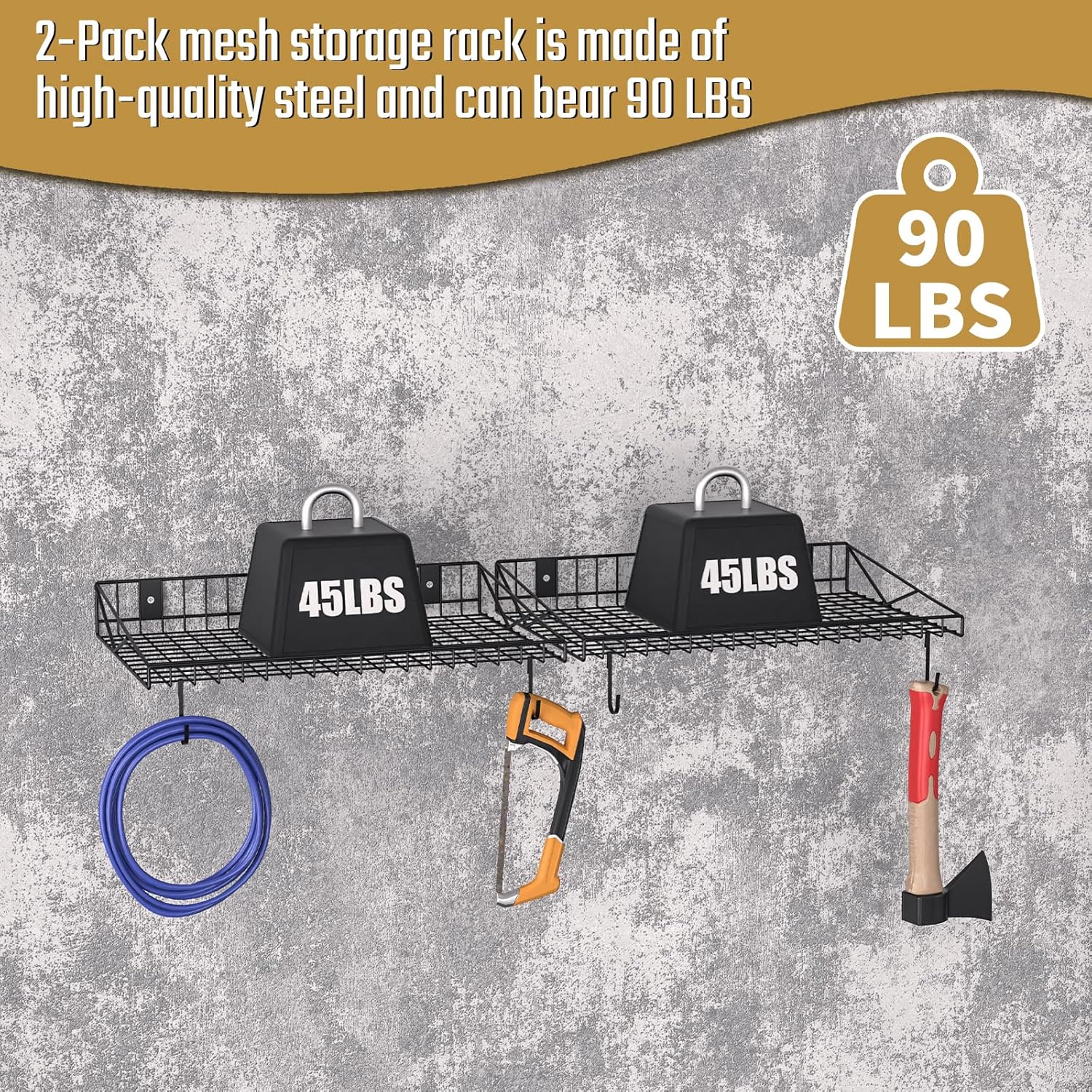 2 Pack Garage Wall Shelf, Garage Wall Mounted Shelving, Heavy Duty Floating Shelves With 4 Hooks, Loads 90 LBS Black Wall Shelves Mesh Storage Rack for Office, Basement, Wall Cabinet and Kitchen
