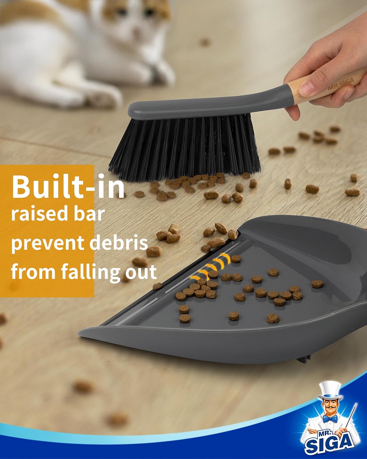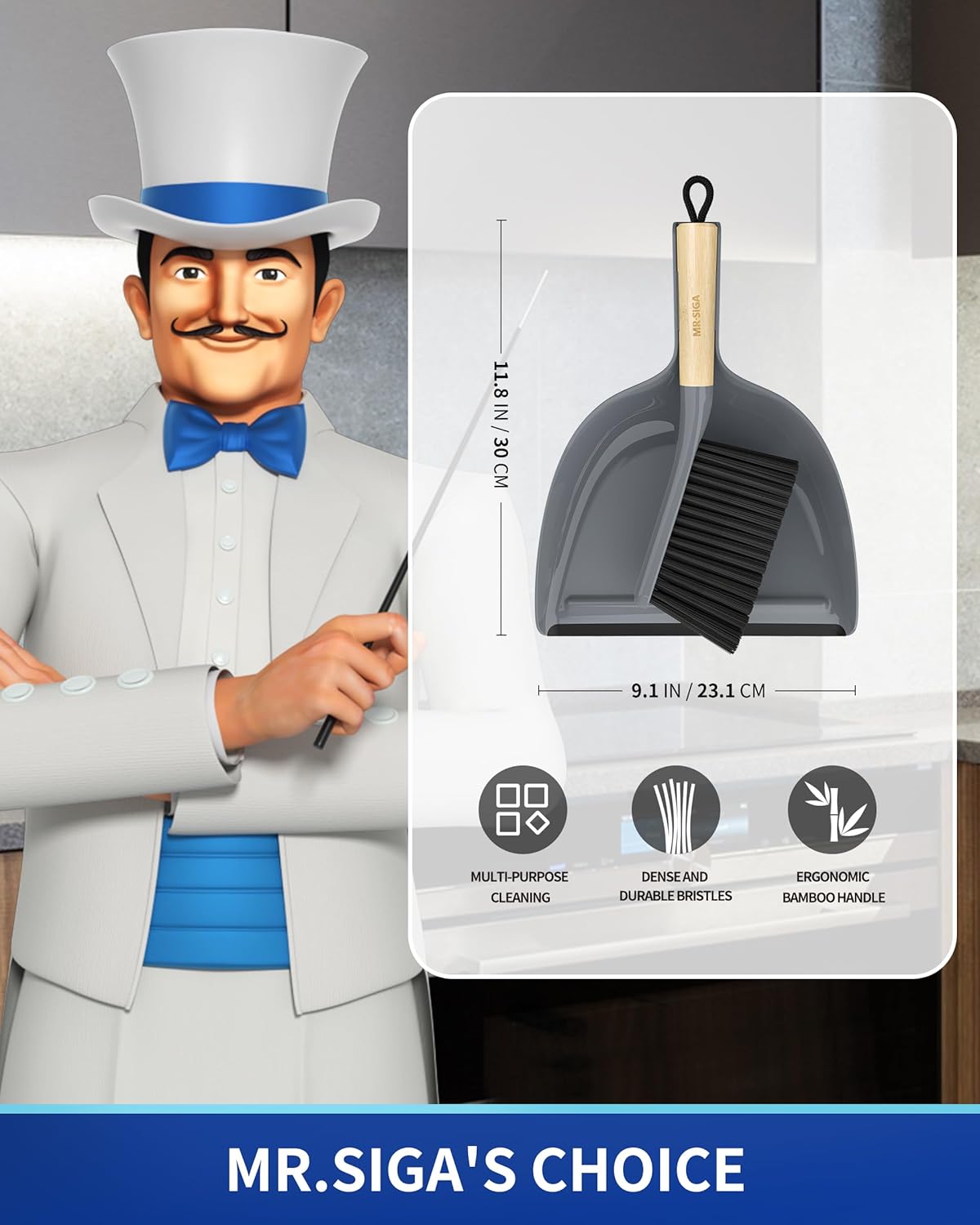 • Elegant and compact design. MR.SIGA handheld dustpan and brush set has a natural bamboo handle, its portable design makes it easy to carry and store, ideal for quick clean-ups anywhere in the home or office. Measures 13 " x 9.2 "