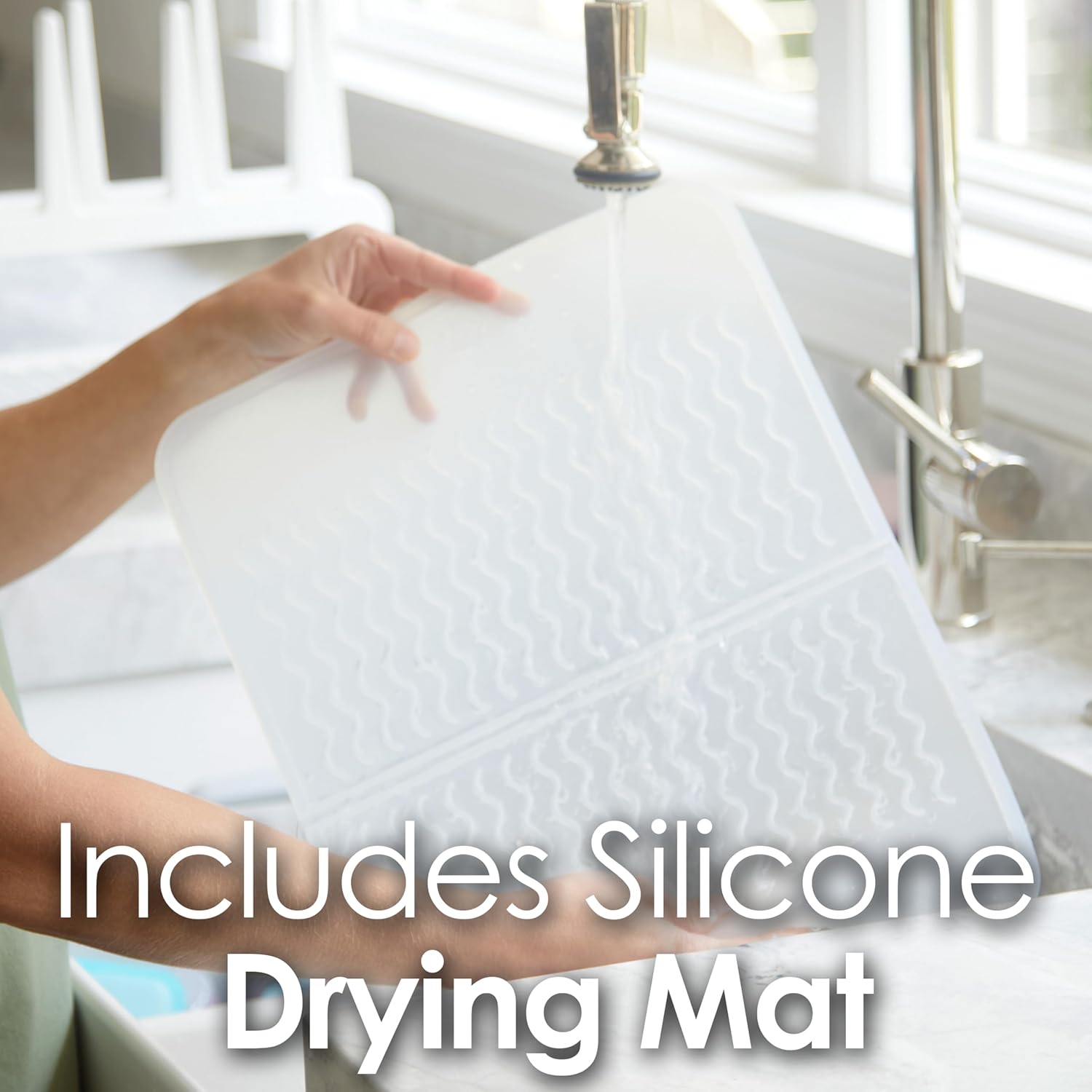 PopYum Glacier White Space Saving Drying Rack from 100% Recycled Bottles with Clear Frosted Silicone Drying Mat, countertop for Baby Bottles, Plastic Bags, Cups, Glass, tumblers, Compact