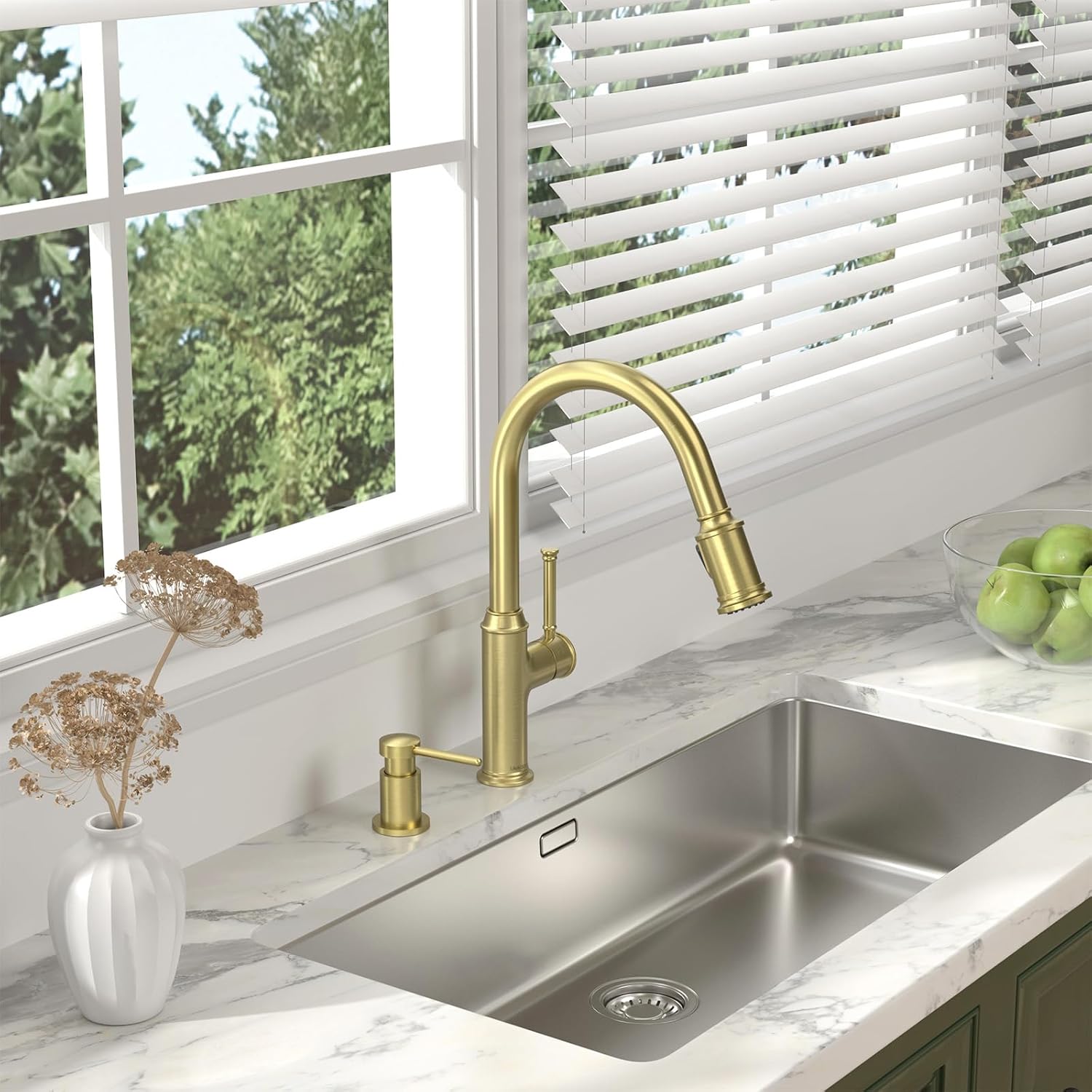 - Modern Design- The brushed gold soap dispenser designed for kitchen sinks, boasts a sleek nozzle.ensuring a smooth transition between pumping and dispensing and offering both practicality and aesthetic appeal. Dimesions - The soap dispenser for kitchen sink nozzle extends 2.25 inches.
