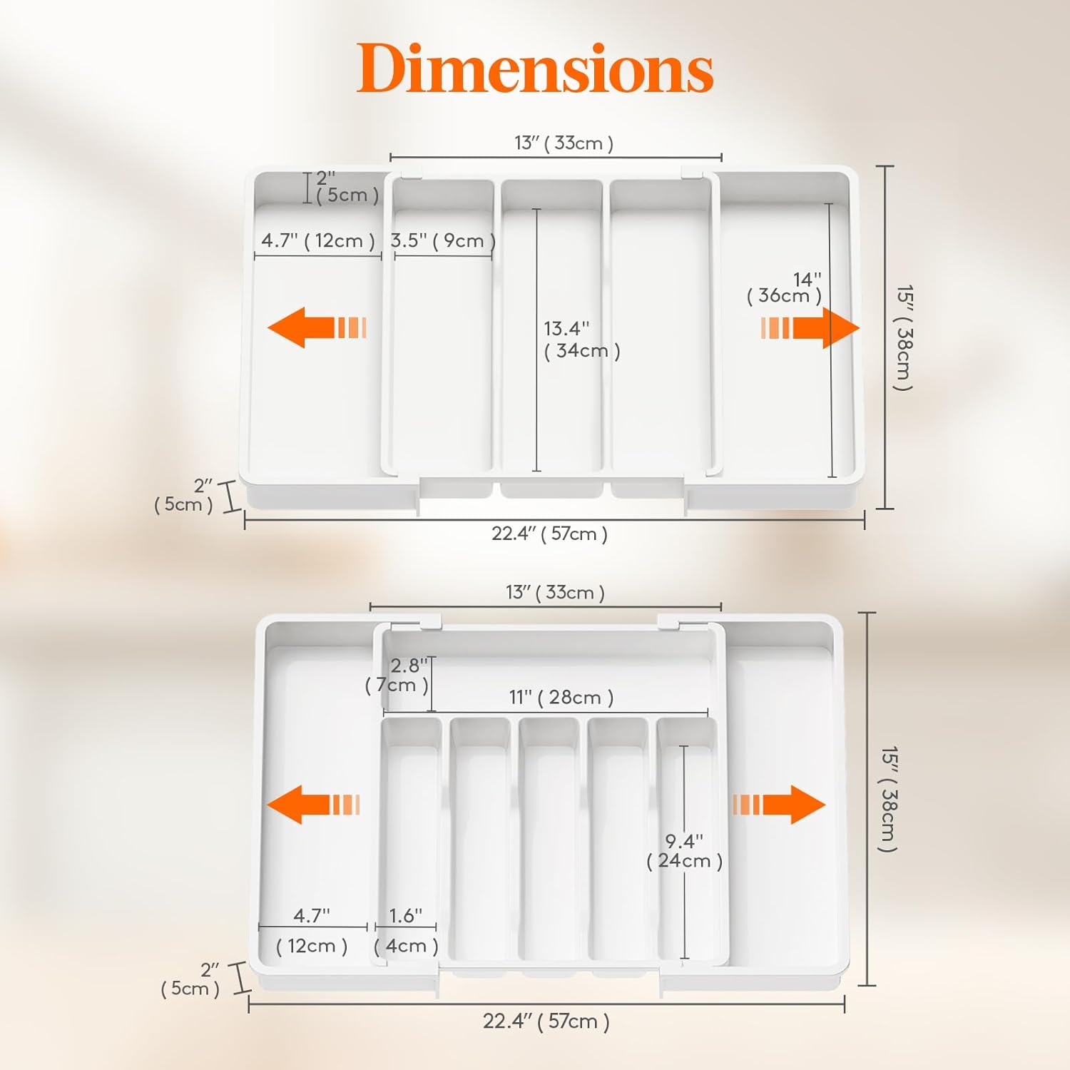 • Adjustable Size: With a width of 13 to 22.4 inches, each kitchen drawer organizer fits various drawer sizes. Fully expanded, the cutlery drawer organizer measures 22.4 x 15 x 2 inches, and when folded, it reduces to 13 x 15 x 2 inches, making it compatible with any kitchen drawer
