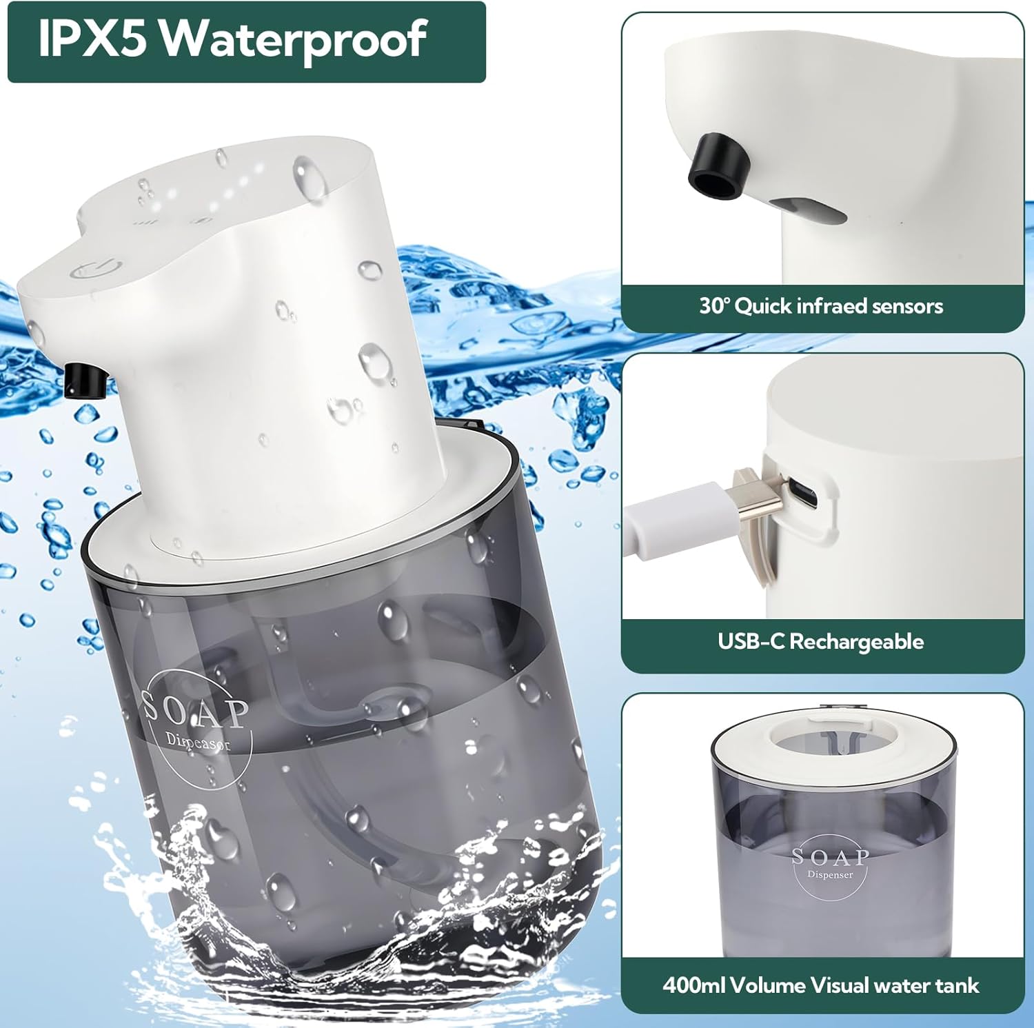 • 【IPX5 Waterproof & Leak-Proof Design】The IPX5 waterproof rating protects the dispenser from soap and water damage, while the rubber plug covering the USB charging port ensures leak-proof performance, making it reliable for use in wet environments like bathrooms and kitchens.