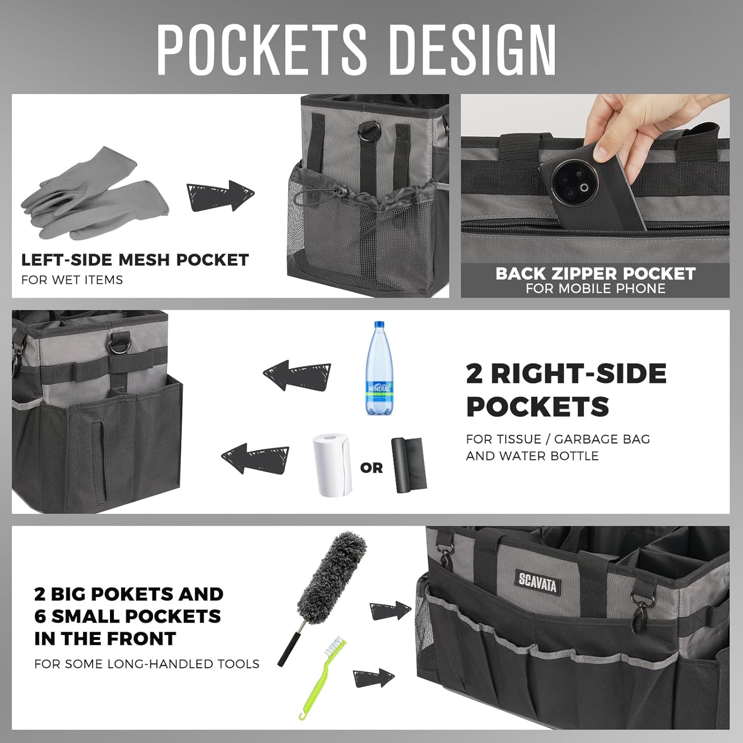 • Exquisite Details: The 5 inner compartments are large enough for organizing cleaning tools. 3 individual deep outer pockets, 1 mesh side pocket and 1 trash bag dispenser allow you storage and access of other cleaning tools. Also, securely zipped pocket is design for safely storing your important items