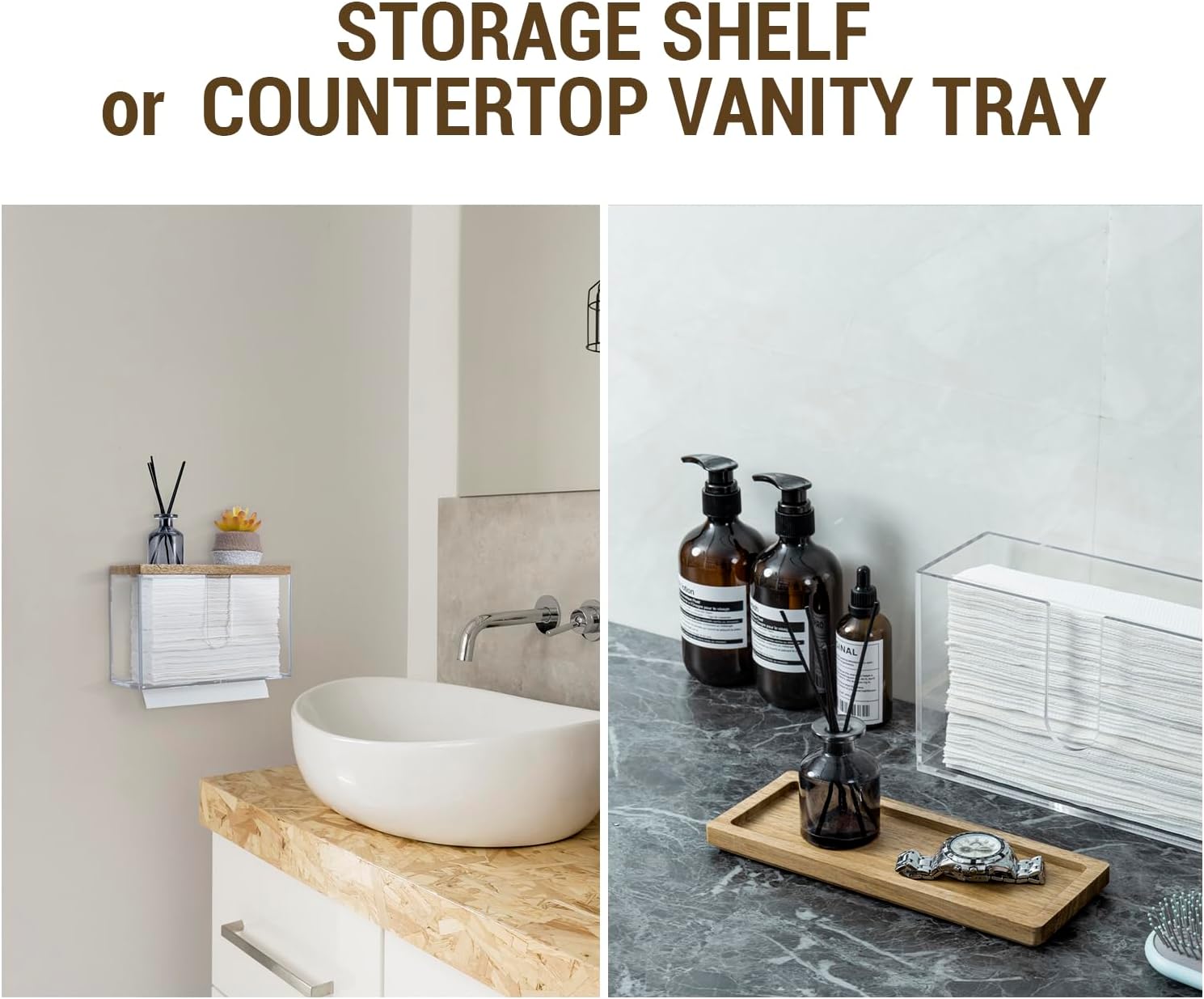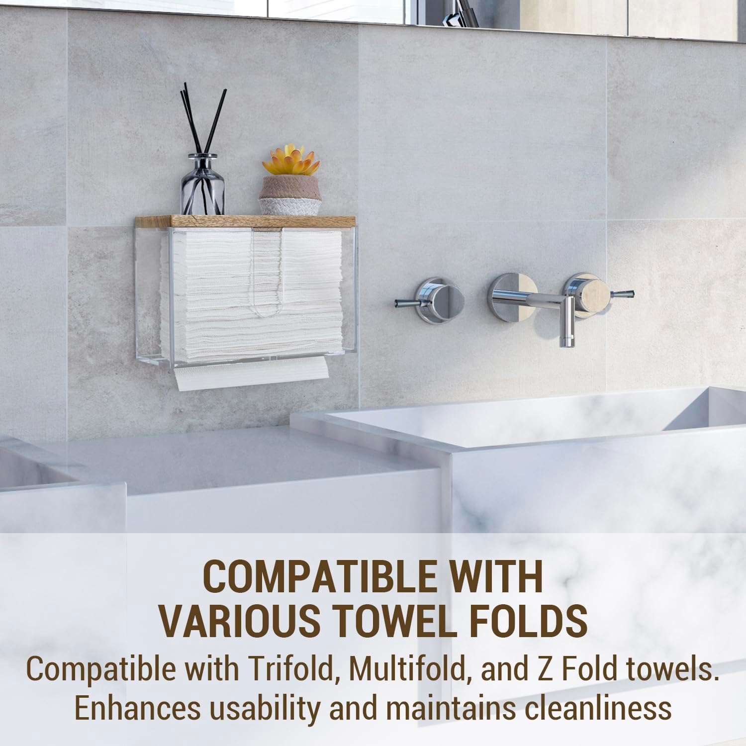 • Wall mounted folded paper towel holder and wooden display tray for commercial guest use in a bathroom, kitchen, office break room, and more