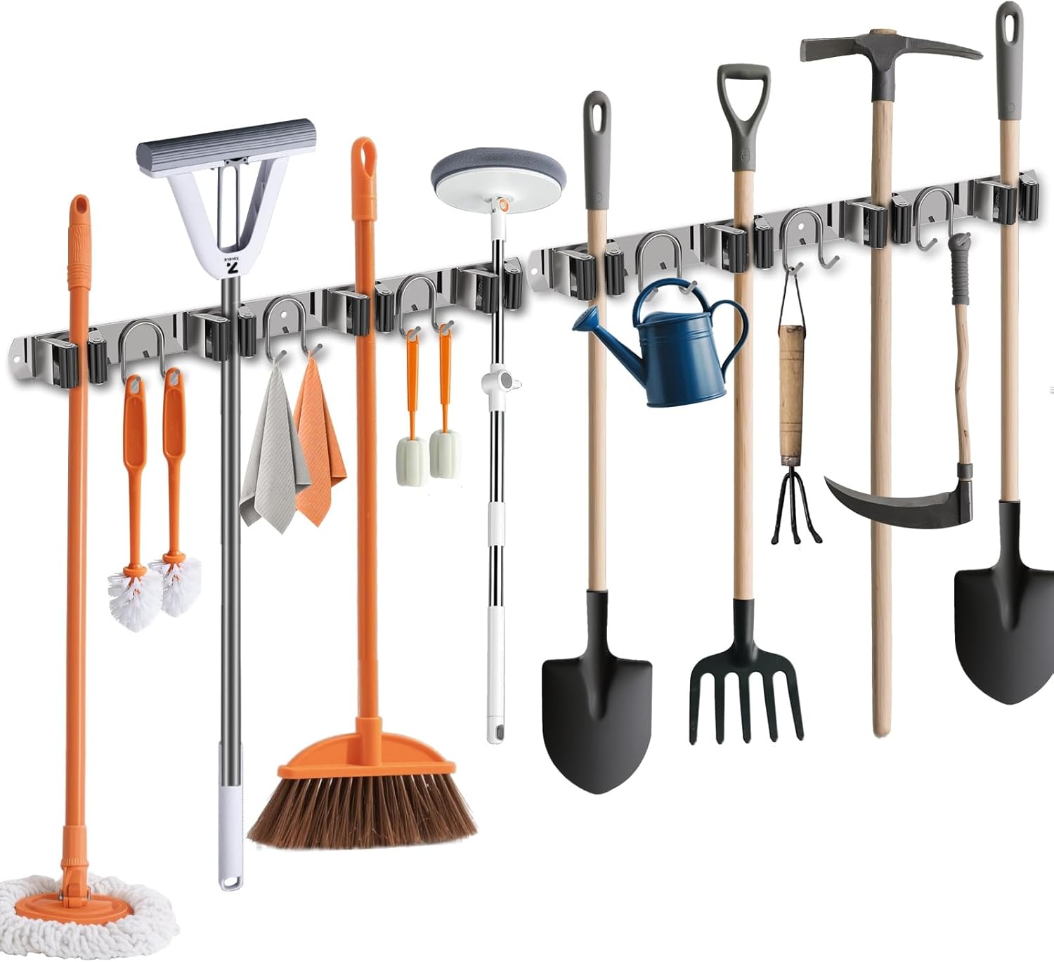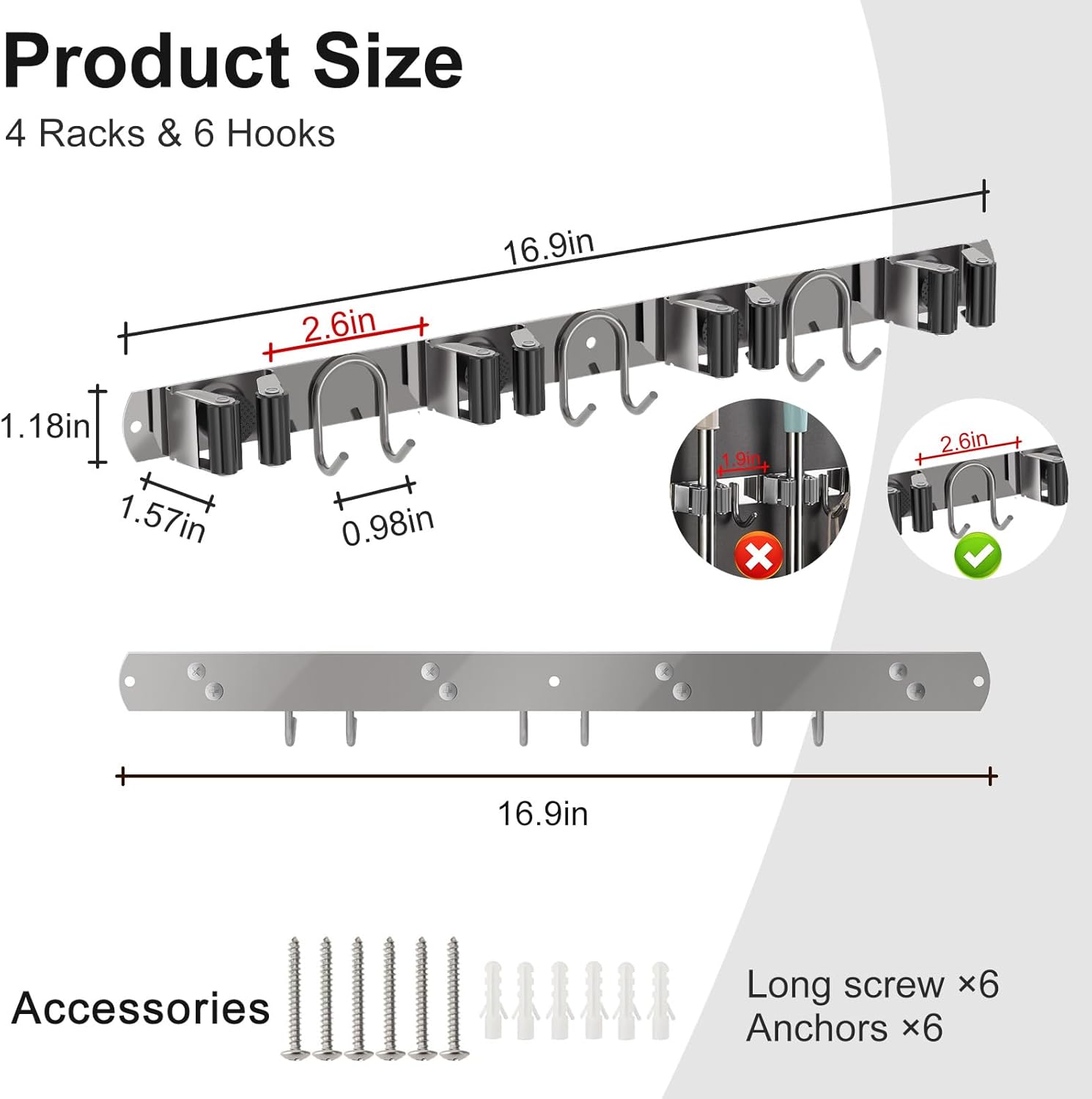 • Spacious 6-Hook Mop Holder: Features 4 slots and 6 hooks with smart spacing (5.12" slots, 4.72" hooks) for maximum storage. Saves space while holding multiple brooms, mops and tools effortlessly