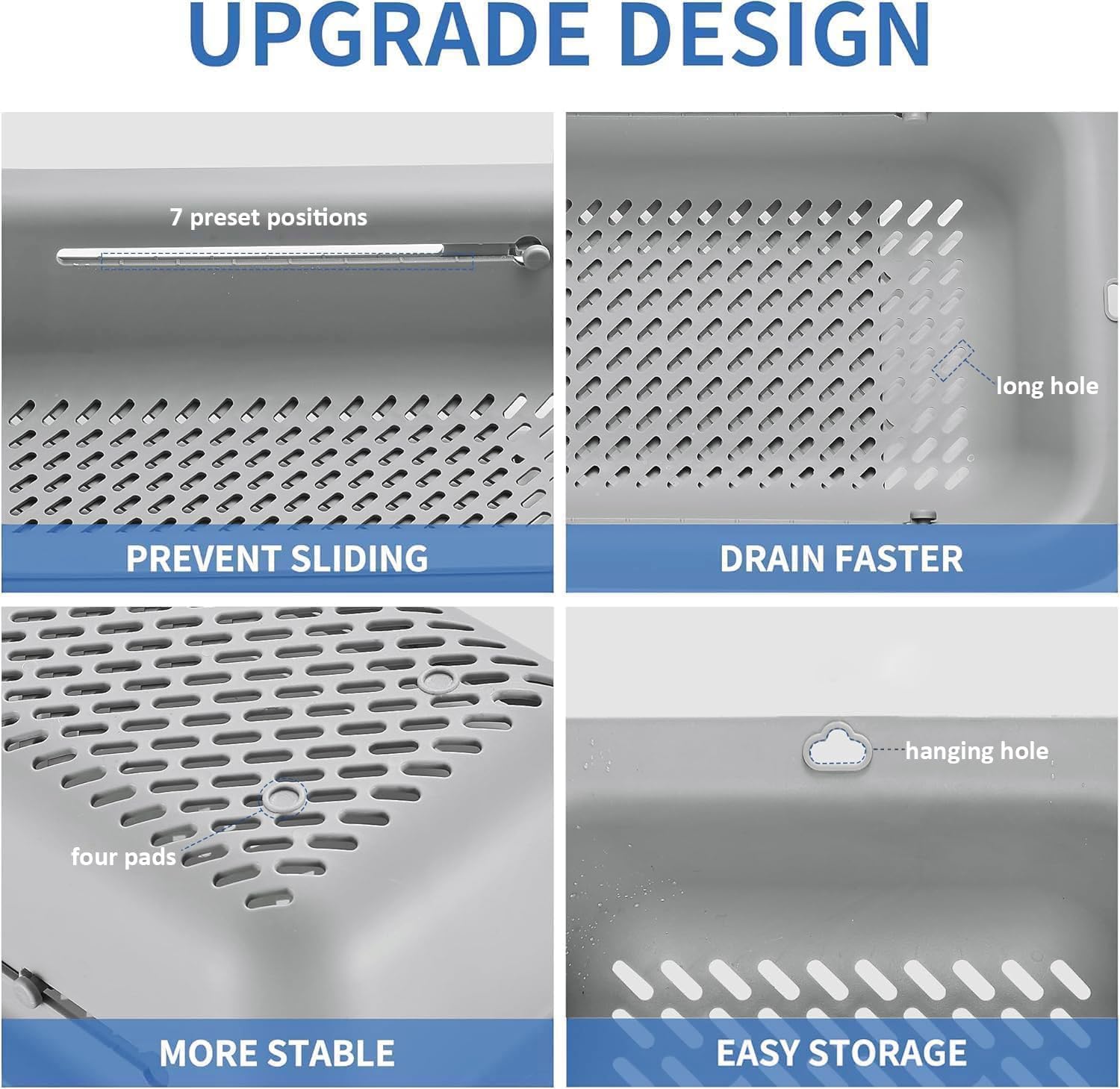 • LASSHSWA upgrade the colander, 7 preset positions - PREVENT SLIDING, long hole - DRAIN FASTER, four pads - MORE STABLE, hanging hole - EASY STORAGE.