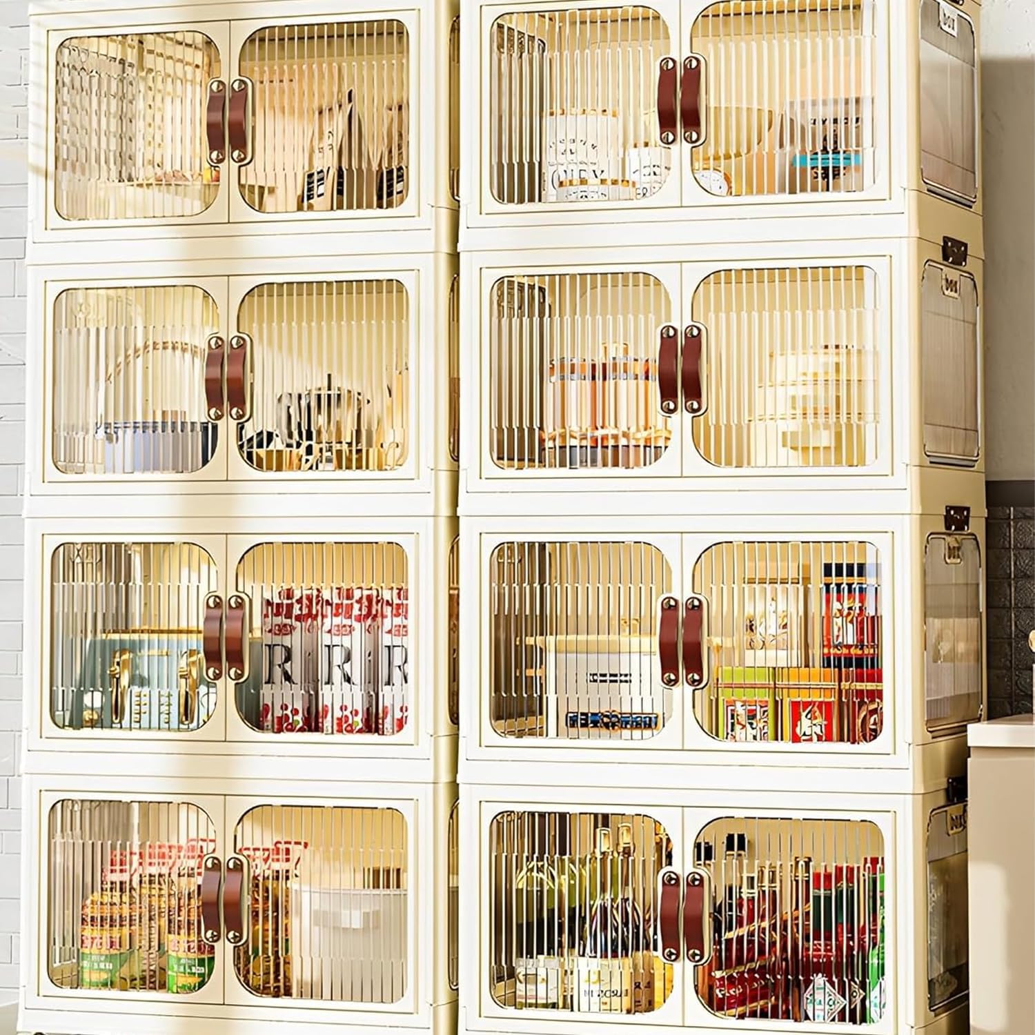 • 【Dual Access Design】 Experience convenience with storage bins that open two ways – via the top lid or the front door equipped with a magnetic latch to prevent accidental openings. The front door grants easy access to contents without disrupting the stack, shielding items from dust.