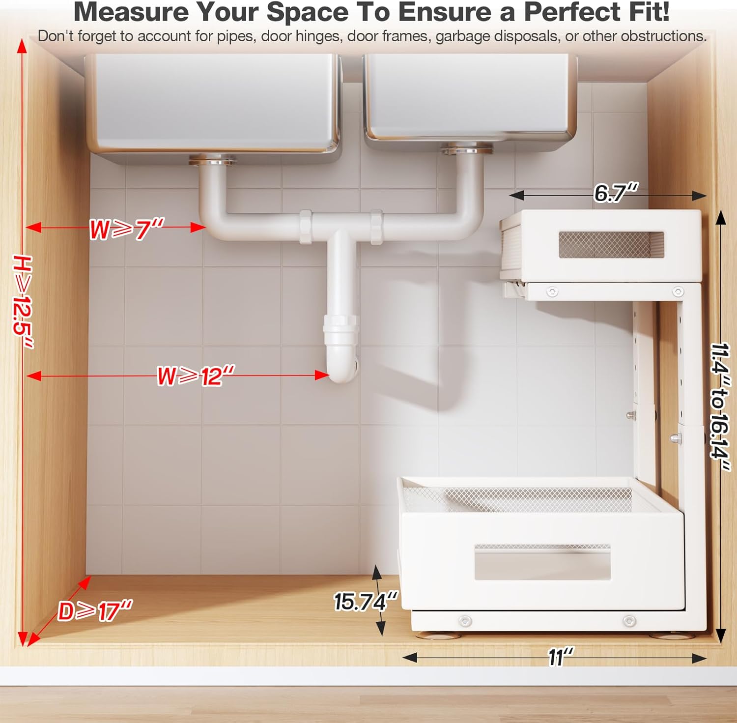 - 【Maximize Your Space】This organizer features an L-shaped design and 5-level adjustable height to optimize under-sink storage. The narrow top and wide bottom layout avoid pipes and garbage disposal, while providing ample space below for tall bottles. The 5-level height adjustment (11.4-16.14 inches) allows easy customization, adapting to complex pipe setups and ensuring efficient storage for items of various heights, maximizing vertical space and enhancing organization.