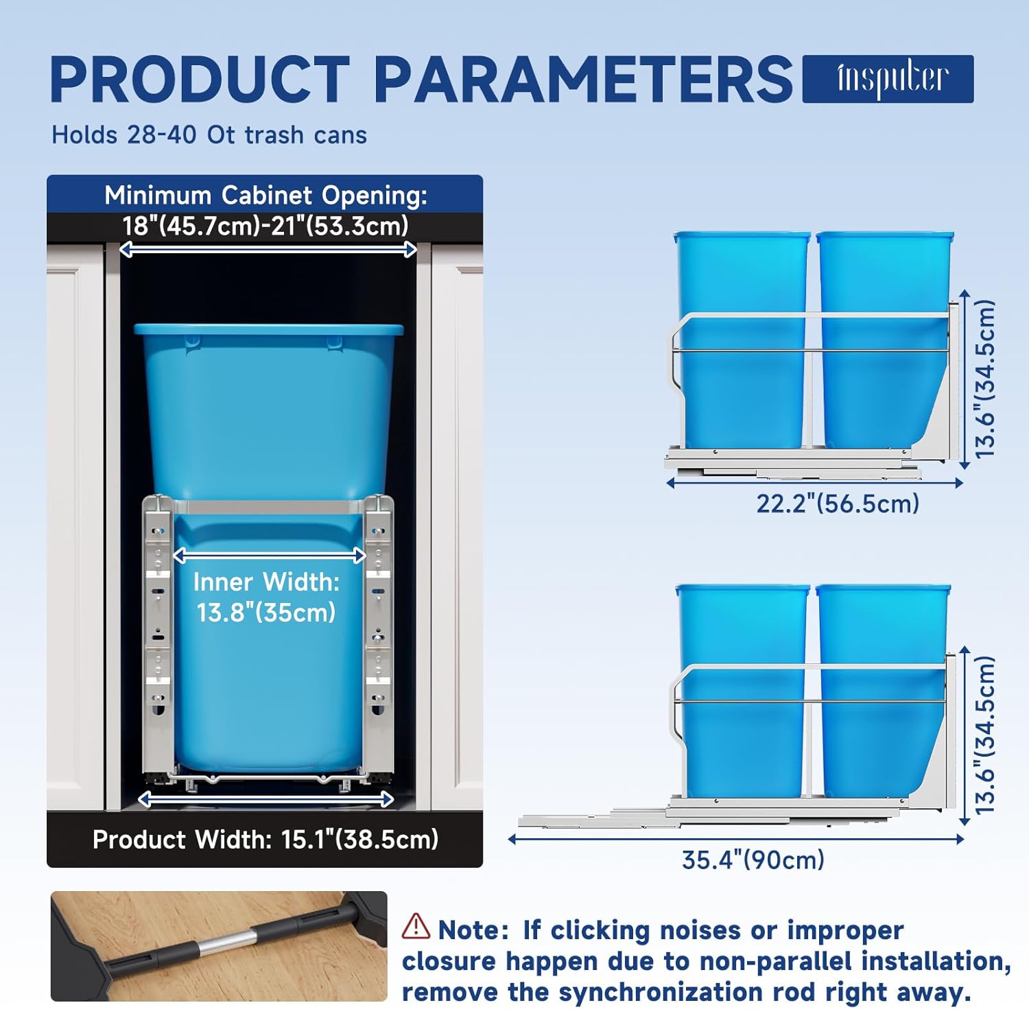 - Save Space: The cabinet garbage can pull out can be perfectly installed under the cabinet and sink, maximizing the use of every inch of storage space in the kitchen. Pull-out trash and recycling bin combo, holds two 28-40 quart trash cans, suitable for various places such as kitchen, storage room, bathroom, laundry room, tool room, etc.