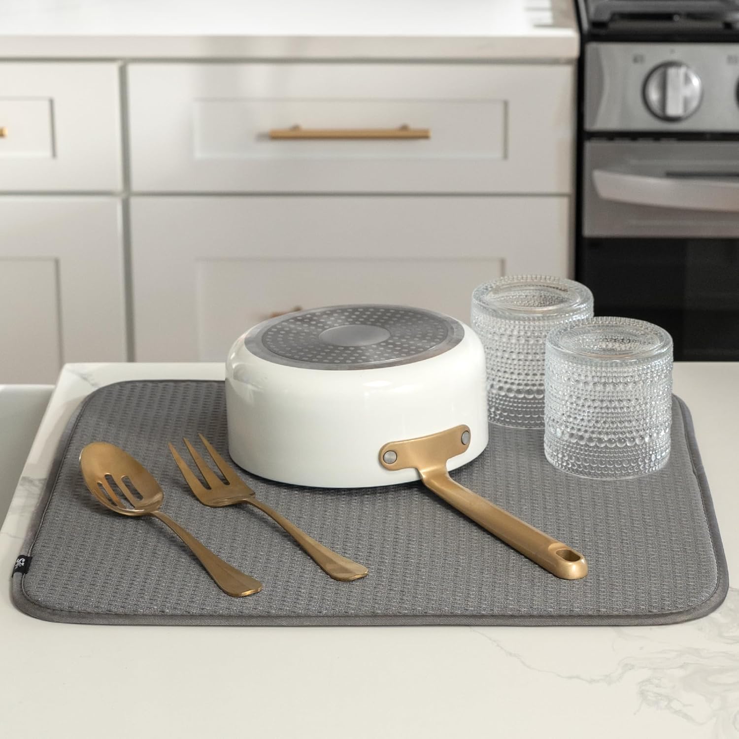 • Dish drying mats for kitchen counter are reusable, machine washable, and easy to store for kitchen organization; durable construction will not chip or break like a stone dish drying mat for kitchen