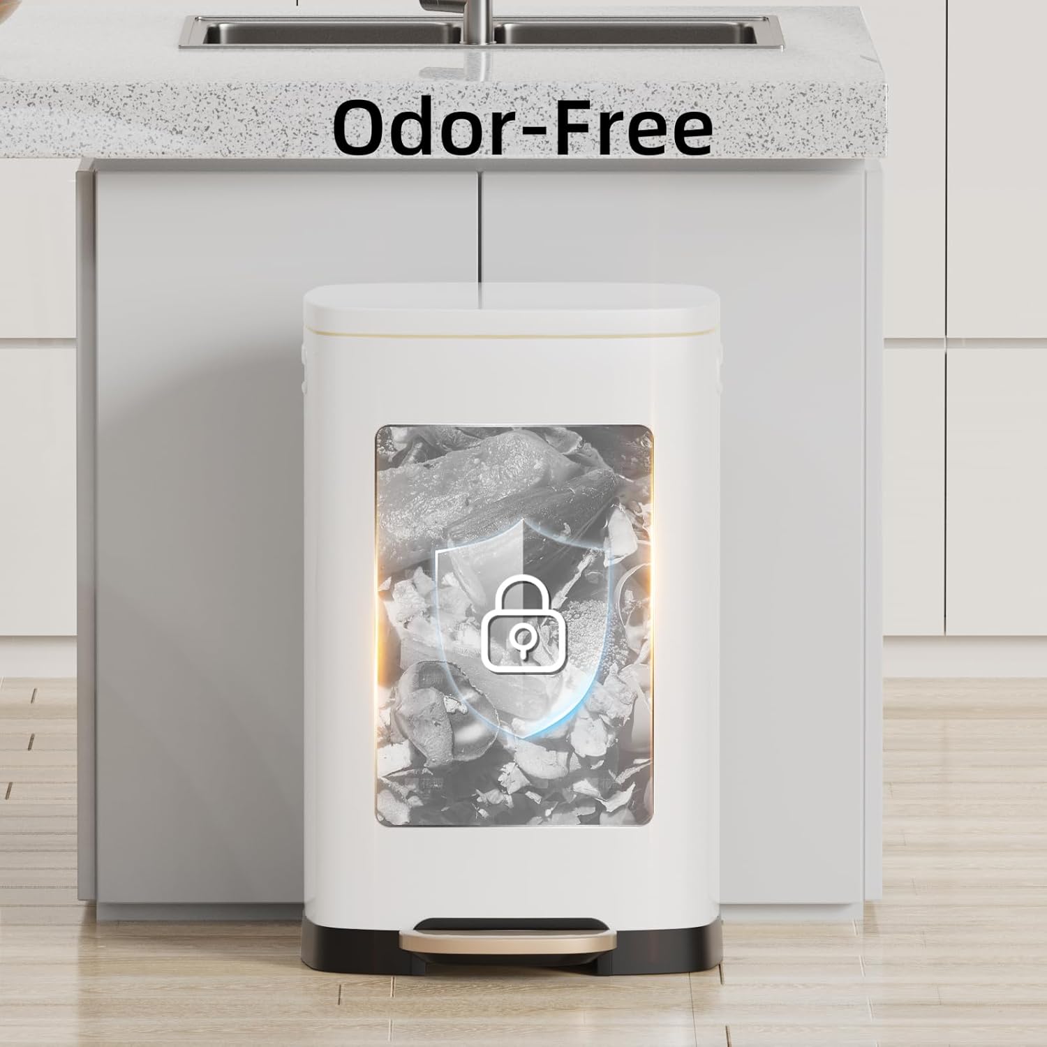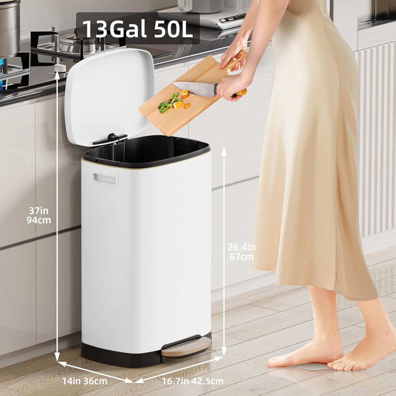 • ๐Ÿšฎ Large Capacity & Odor Lock Technology: 50L (13 Gallon) extra-large capacity reduces frequent trash runs, perfect for busy kitchens. Sealed lid with odor-blocking design traps smells, keeping your space fresh and clean.
