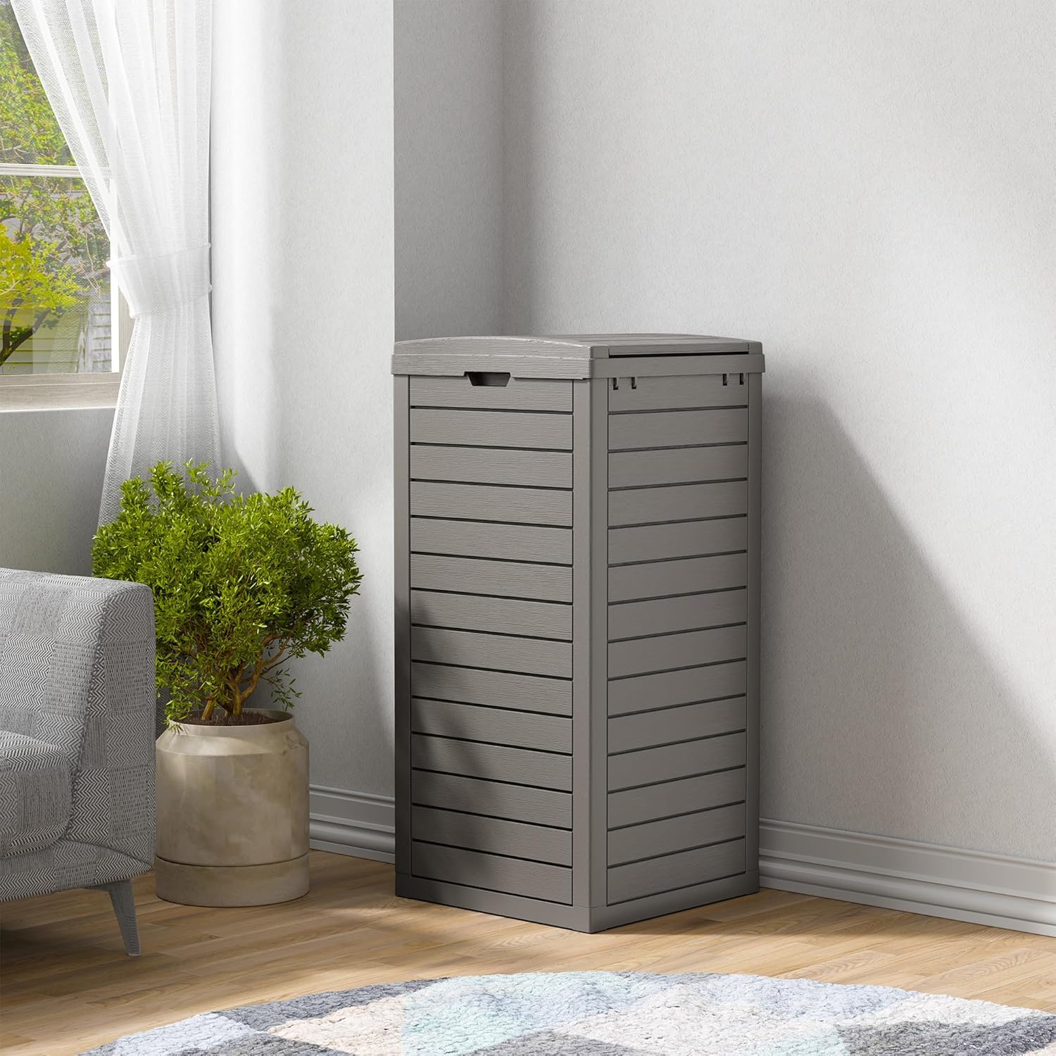 • Waterproof Material - The outdoor garbage can is made of stable and recyclable resin material that is waterproof and fade resistant. The panels are sturdy and will not bend, warp or break easily and are highly weather resistant.