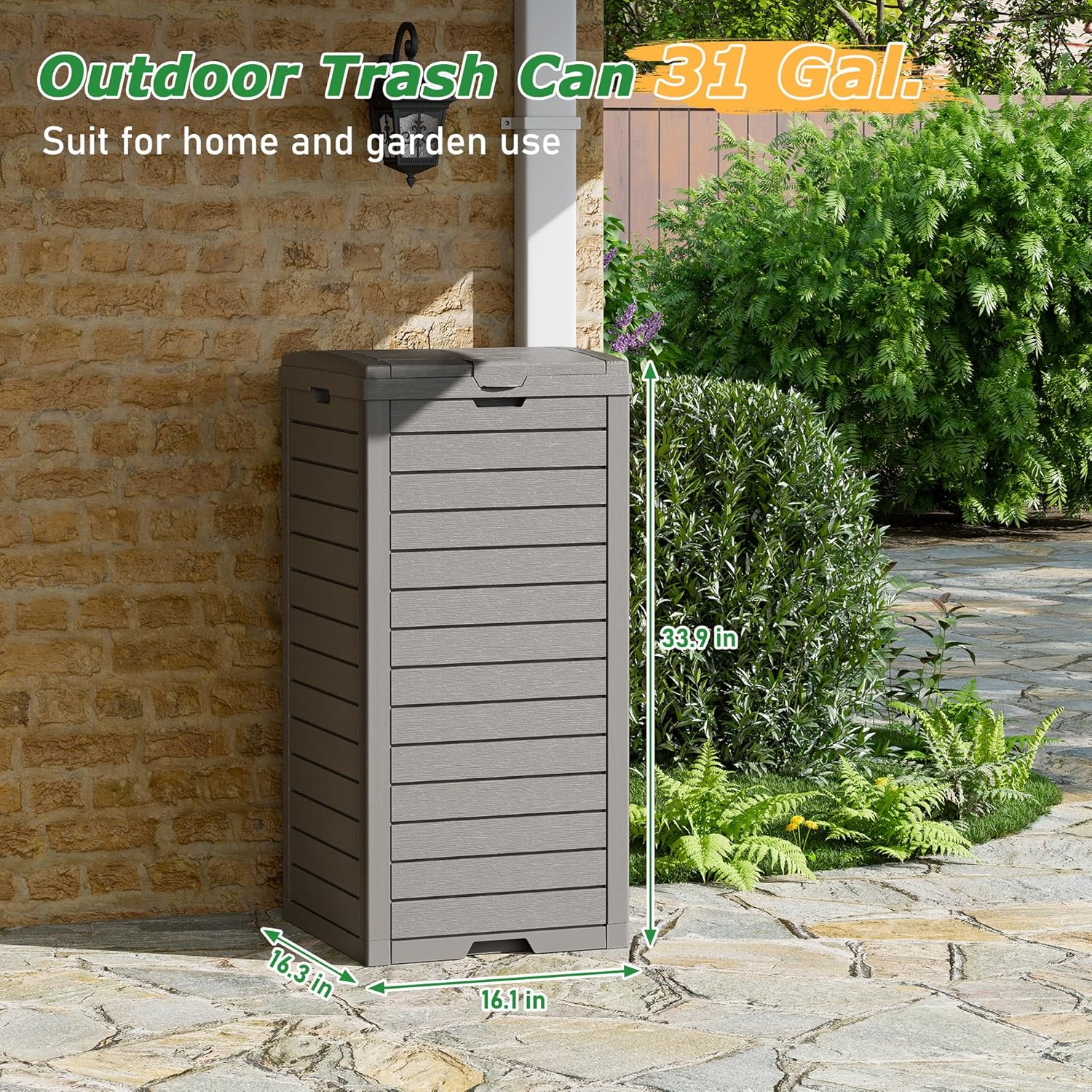 • 31 Gal Capacity - 16.10*16.26*33.86 in, compatible with 33-40 gallon trash bags-43~47"L*28~30"W, the outdoor trash can is suitable for storing indoor and outdoor trash and keeping the house and patio clean.