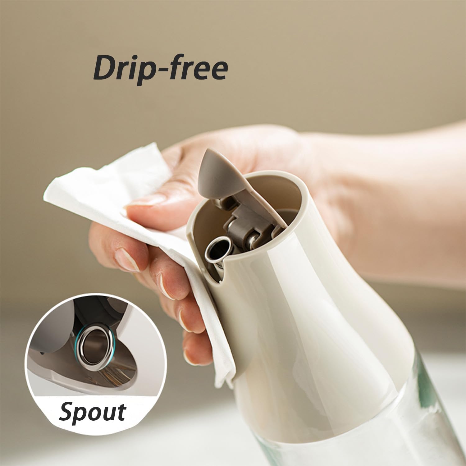 • PREMIUM FOOD-GRADE GLASS AND AUTOMATIC FLIP-TOP DESIGN: The cooking oil dispenser is made of high-temperature resistant, BPA-free food-grade glass and stainless steel spout to ensure durability and no odor. The innovative automatic flip-top design opens smoothly by tilting, preventing oil drips and spills, keeping the countertop clean. The lid closes securely to lock in freshness and prevent oil stains, moisture or oxidation