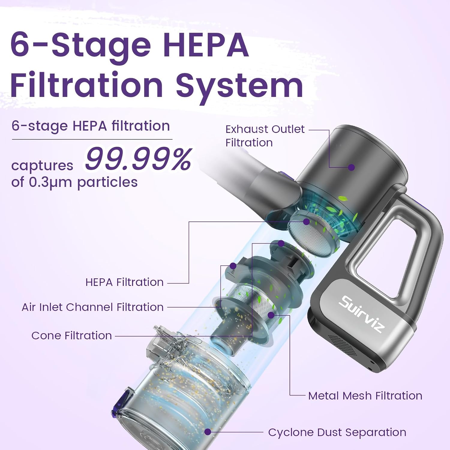 - ♻️HEPA Filtration – Breathe Easy with Clean Air♻️ The cordless vacuum for home features an advanced HEPA filtration system that captures 99.97% of particles. Enjoy cleaner, fresher air with every clean, making it an ideal choice for homes with pets. Breathe easy knowing your vacuum is working hard to improve indoor air quality.