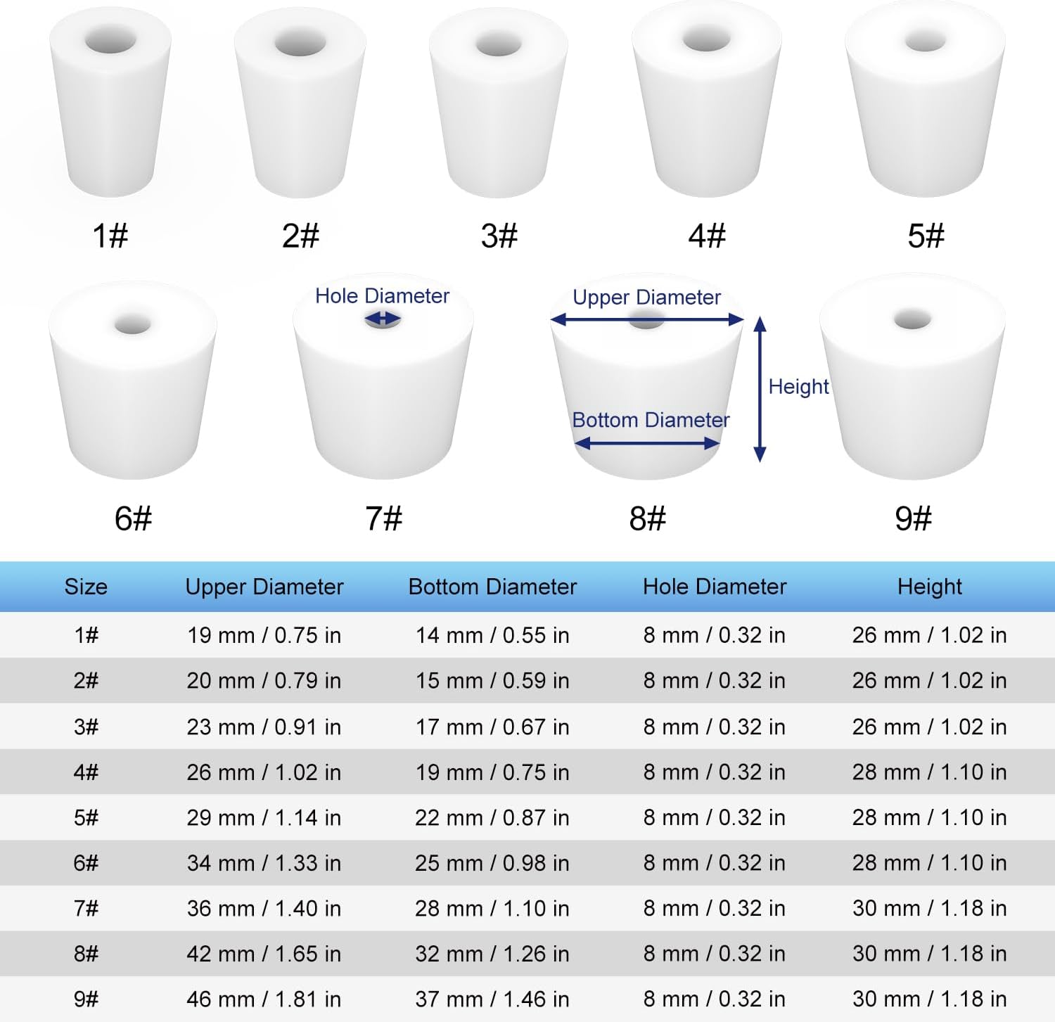 • Versatile Design: Includes 5 single-hole silicone stoppers, each with an 0.31" hole, ideal for various laboratory needs