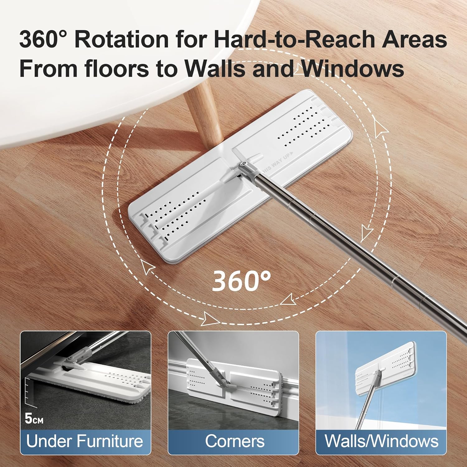 • [Extended Microfiber Mop] With 360°rotation and bigger mop head, the flat mop can reach to any corners, those "under-the-whatever" and more wider places for much faster cleaning job! The adjustable Stainless Steel Handles can be extended from 26.5 to 60.0 inches, great for wet dry mops or dust mops for wall cleaning