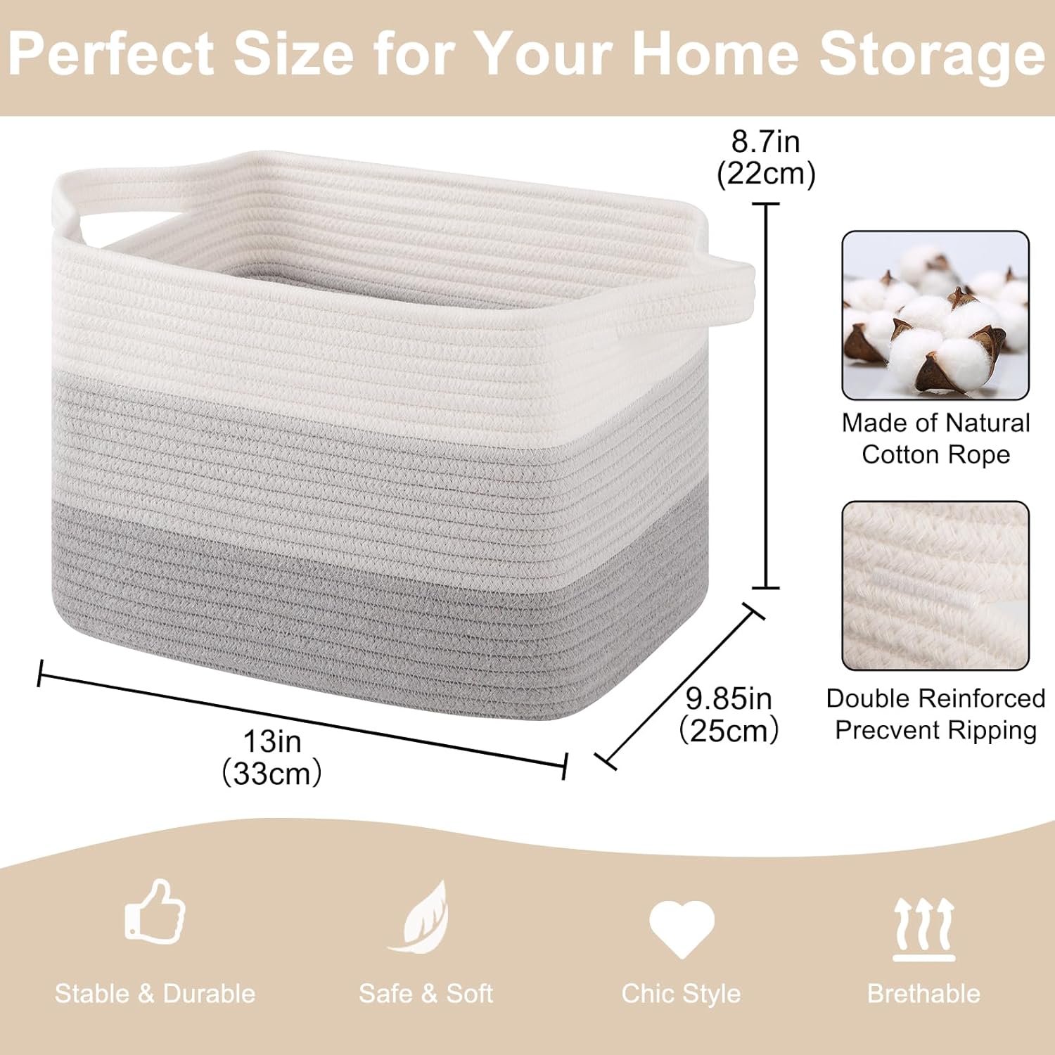- Soft and Durable: Our shelf baskets are meticulously handcrafted from high-quality natural cotton rope that's ultra-soft and durable. No odor or sharp corners, making it safe for babies, and won't scratch your furniture and floor. Ideal for nurseries and playrooms