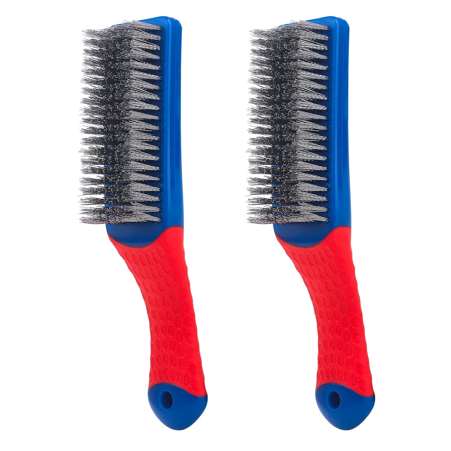 Wire Brushes 2 Pcs Steel Brushes Heavy Duty Carbon Steel and Stainless Steel Wire Scratch Brush with Rubber Ergonomic Handle (16x3.5cm)