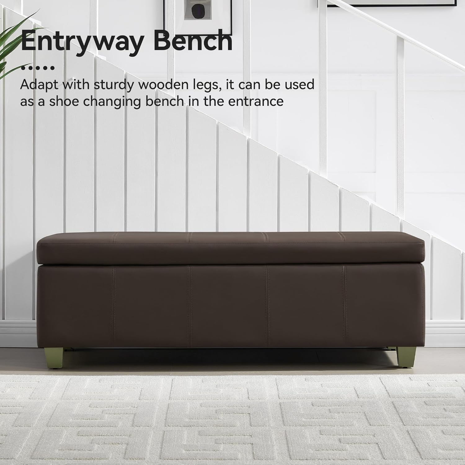 51" Faux Leather Storage Ottoman, Stitch Tufted Rectangle Upholstered End of Bed Storage Bench, Entryway Large Couch Ottoman with Wooden Legs,Brown