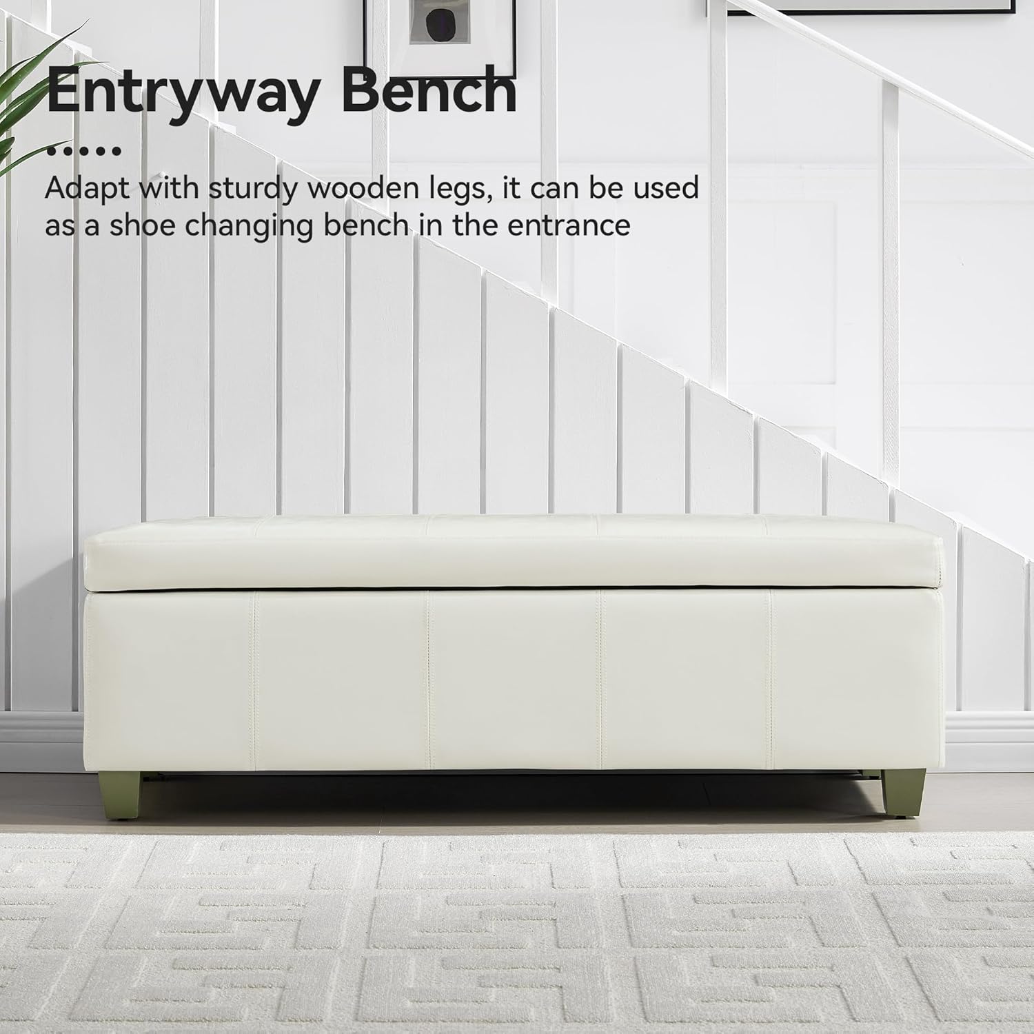 51" Faux Leather Storage Ottoman, Stitch Tufted Rectangle Upholstered End of Bed Storage Bench, Entryway Large Couch Ottoman with Wooden Legs,White