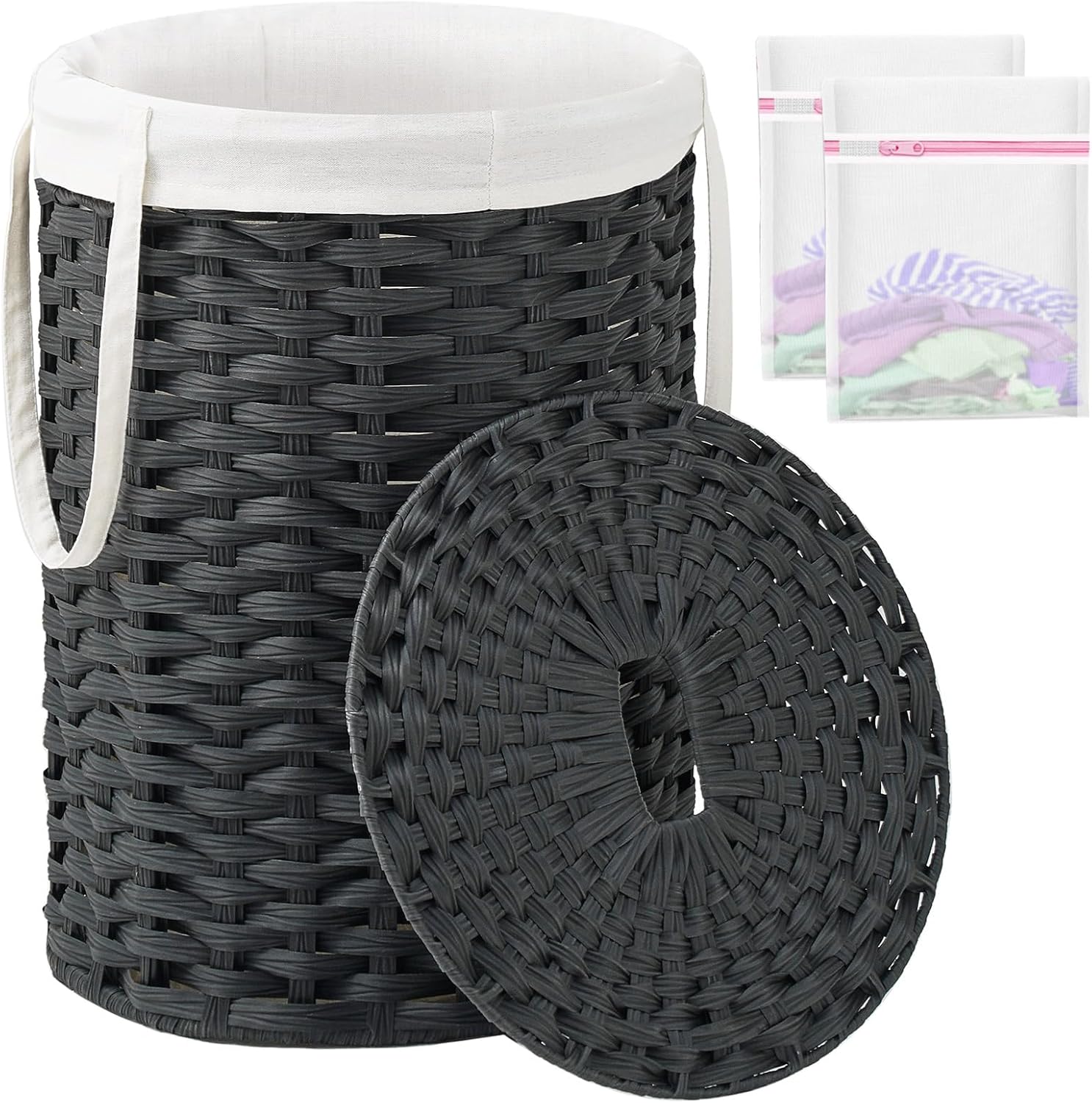 Laundry Hamper with Lid Laundry Basket with Lid 19.0 Gal (72 L) Round Wicker Laundry Basket Handwoven Rattan Basket with Lid Removable Bag 2 Mesh Bags Handles for Living Room Bathroom Black