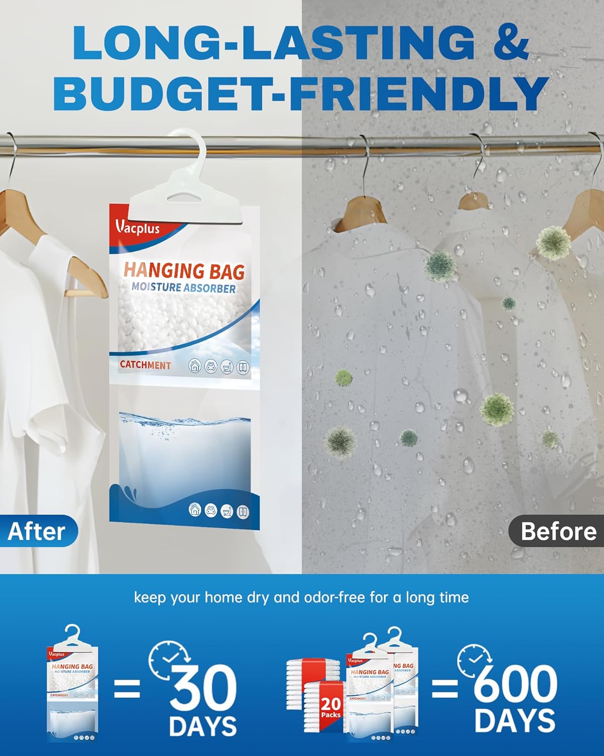 • EASY And SAFE: Vacplus moisture absorber packets provide an easy solution to protecting items and fabrics from excess moisture. By Hanging them up, physical dehumidification gives you a Safe, Green & Energy-saving life.