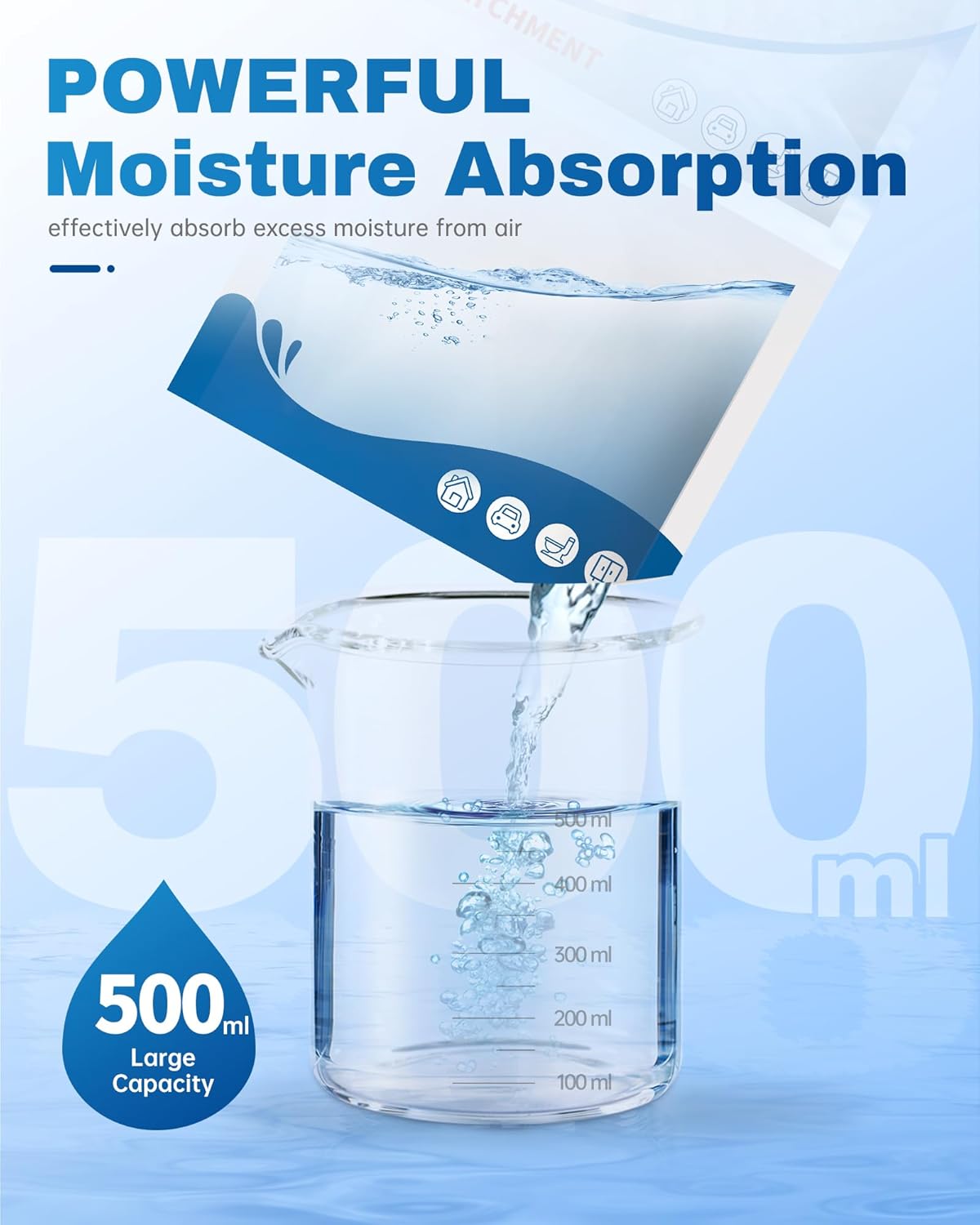 • EFFECTIVE ABSORBING: Vacplus dehumidifier bags use Spherical calcium chloride to enlarge the area to absorb quickly. One-way moisture permeable paper absorbs effectively. 500 ml/pack large capacity moisture absorption keep dry for a long time.