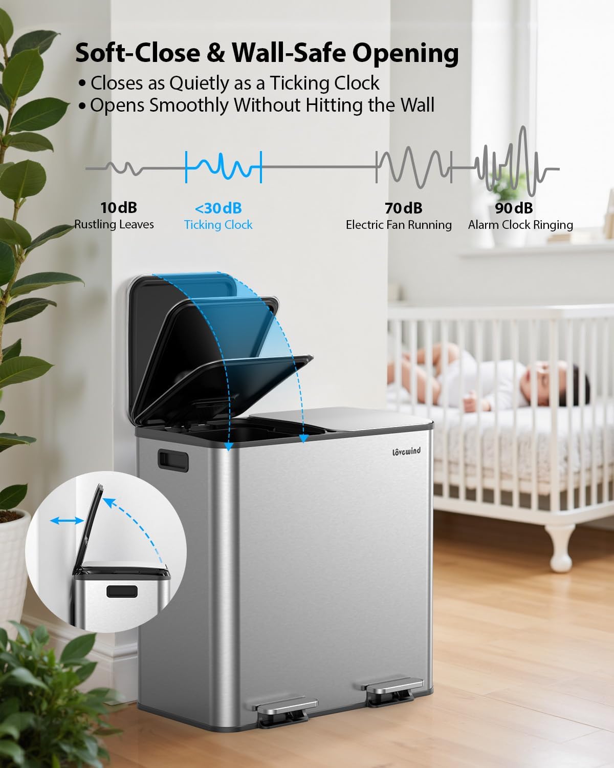 • Dual Compartment Design: Lovewind stainless steel pedal kitchen trash can features 2 x 10.5-gallon removable buckets, which can hold a total of 21 gallons of trash, ideal for waste sorting and recycling at home or in the office