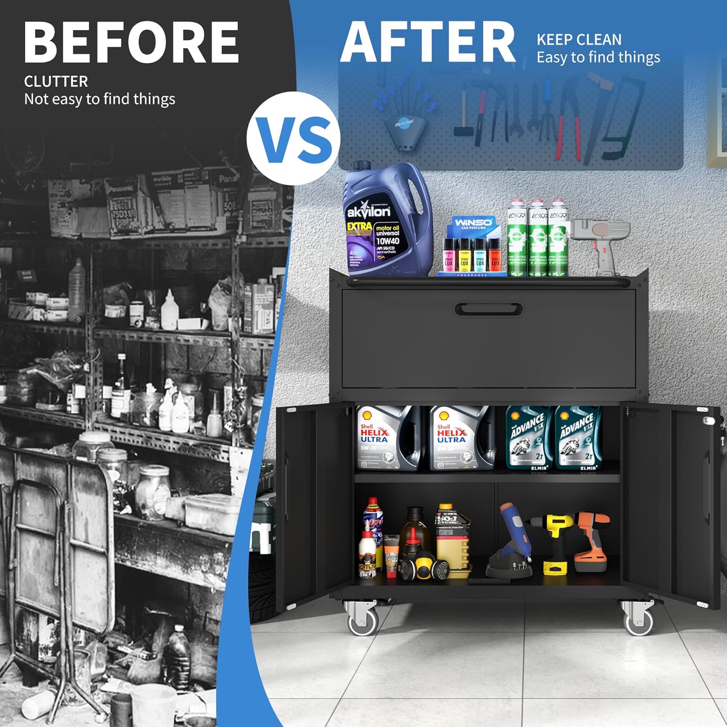 • MULTIPLE STORAGE OPTIONS: The cabinet measures 16.54"D x 29.53"W x 34.66"H. The cabinet comes with 1 large capacity drawer and 2 lockable doors and the top of the cabinet can also be used as a workbench. It is perfect for storing tools in the garage.