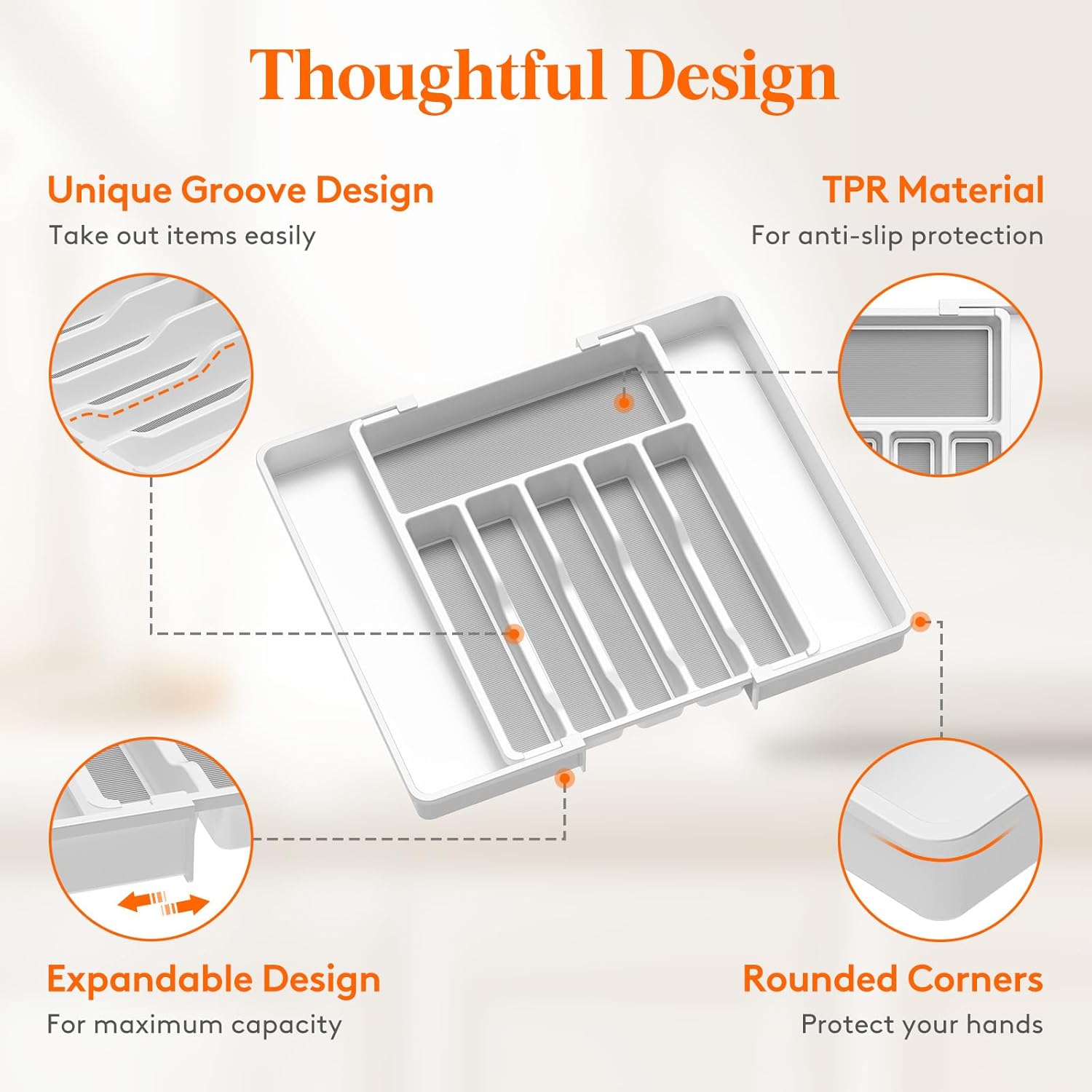 • Anti-Slip Protection: The middle six compartments of this kitchen drawer organizer are lined with soft yet non-slip TPR to prevent damage to your silverware during drawer pulls, offering excellent protection for your silverware