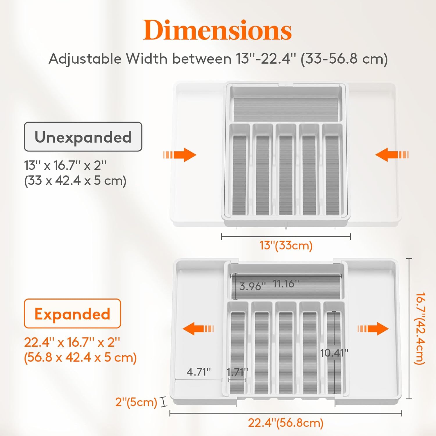 • Expandable Design: This silveware organizer can expand from six to eight compartments with an adjustable width range of 12 - 20.2 inches (30.6 - 51.4 cm), fitting drawers of different sizes. When fully expanded, its size is 22.4 x 16.7 x 2 inches (56.8 x 42.4 x 5 cm), and when folded, its size is 13 x 16.7 x 2 (33 x 42.4 x 5 cm)