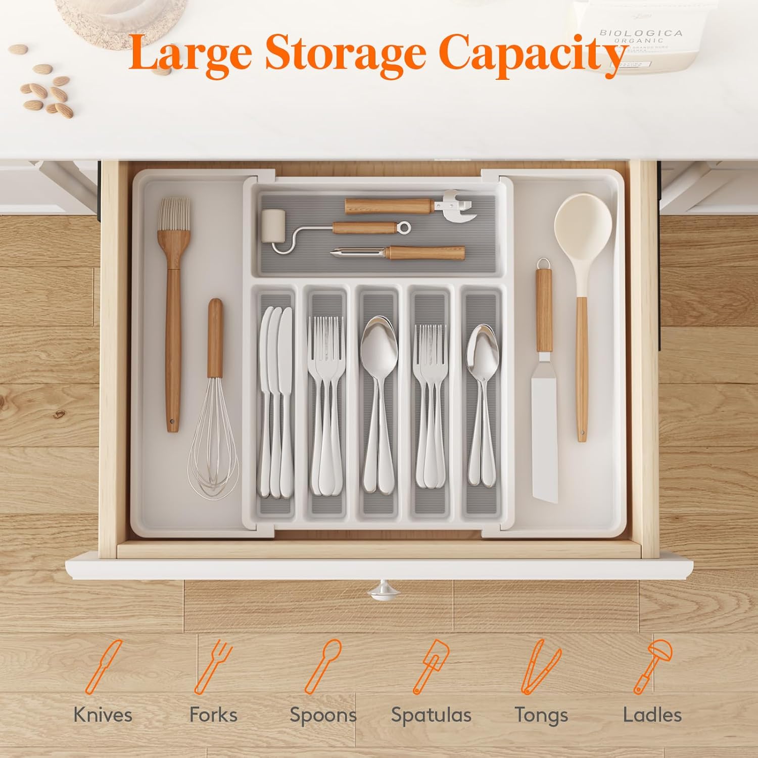 • Large Capacity: This cutlery drawer organizer features six middle compartments and two expandable side panels to maximize storage space for utensils, cookware, and various kitchen items, keeping your kitchen drawers tidy