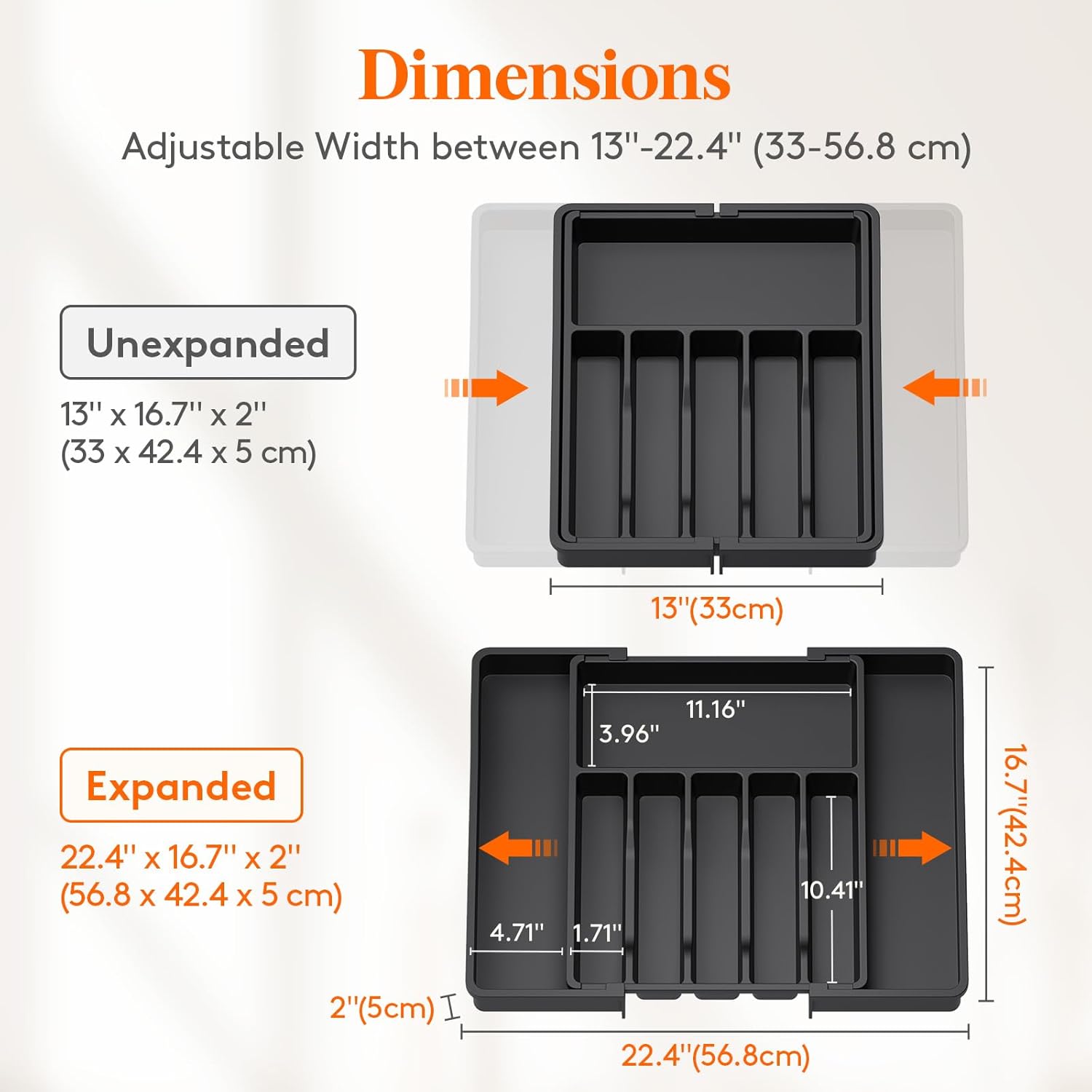 • Adjustable Design: With its retractable design, The Lifewit silverware organizer fits drawers of various sizes and shapes. It measures 13'' wide when folded while reaching 22.4'' when fully expanded. This universal utensil drawer organizer helps you maximize storage space efficiently while keeping your utensils neatly organized and easily accessible