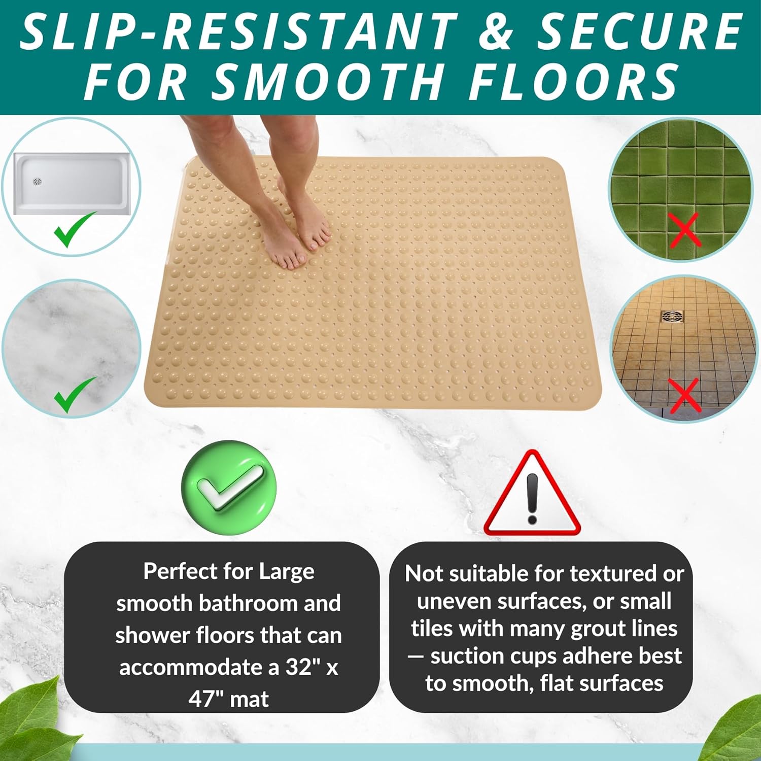 ENKOSI Extra Large Shower Mat Non Slip - 47 x 32 inch - XL Bathroom Shower Mat - Large Shower Mats for Shower Stall Floors - Secure Suction Cups and Drain Holes (47x32 Beige Opaque)