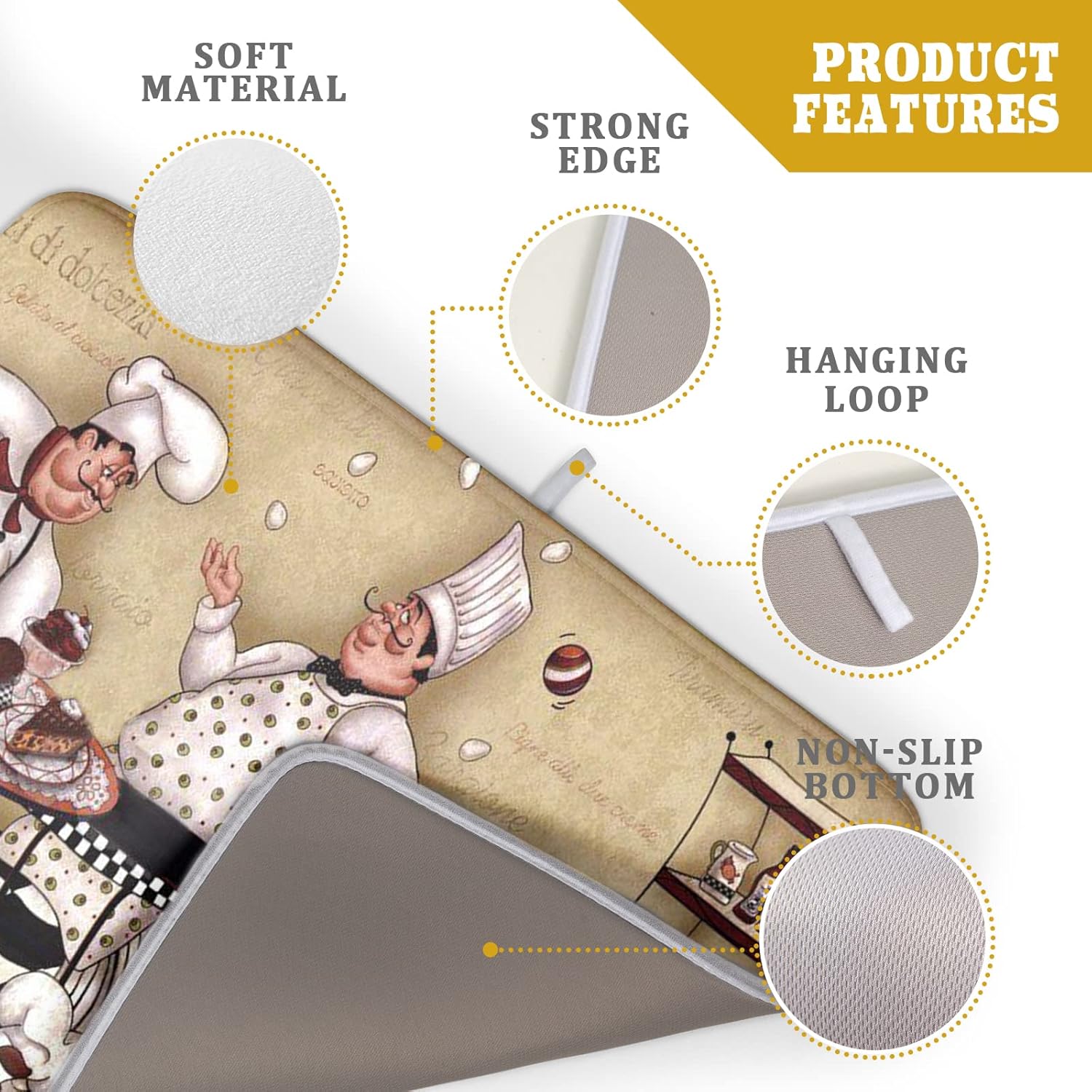 - 【Dish drying mat size】 16x18 inches, high quality polyester fat chef dish drying mat. Made of microfiber,super absorbent and fast drying dish drying mat. Absorbent microfiber, in a 3-layer design without sacrificing its softness. Both sides can be used, one with a Chef Kitchen pattern, the other with a gray non-slip bottom.Chef drying Mat for Coffee Bar Countertops fits most countertops while providing a smart, sharp look.