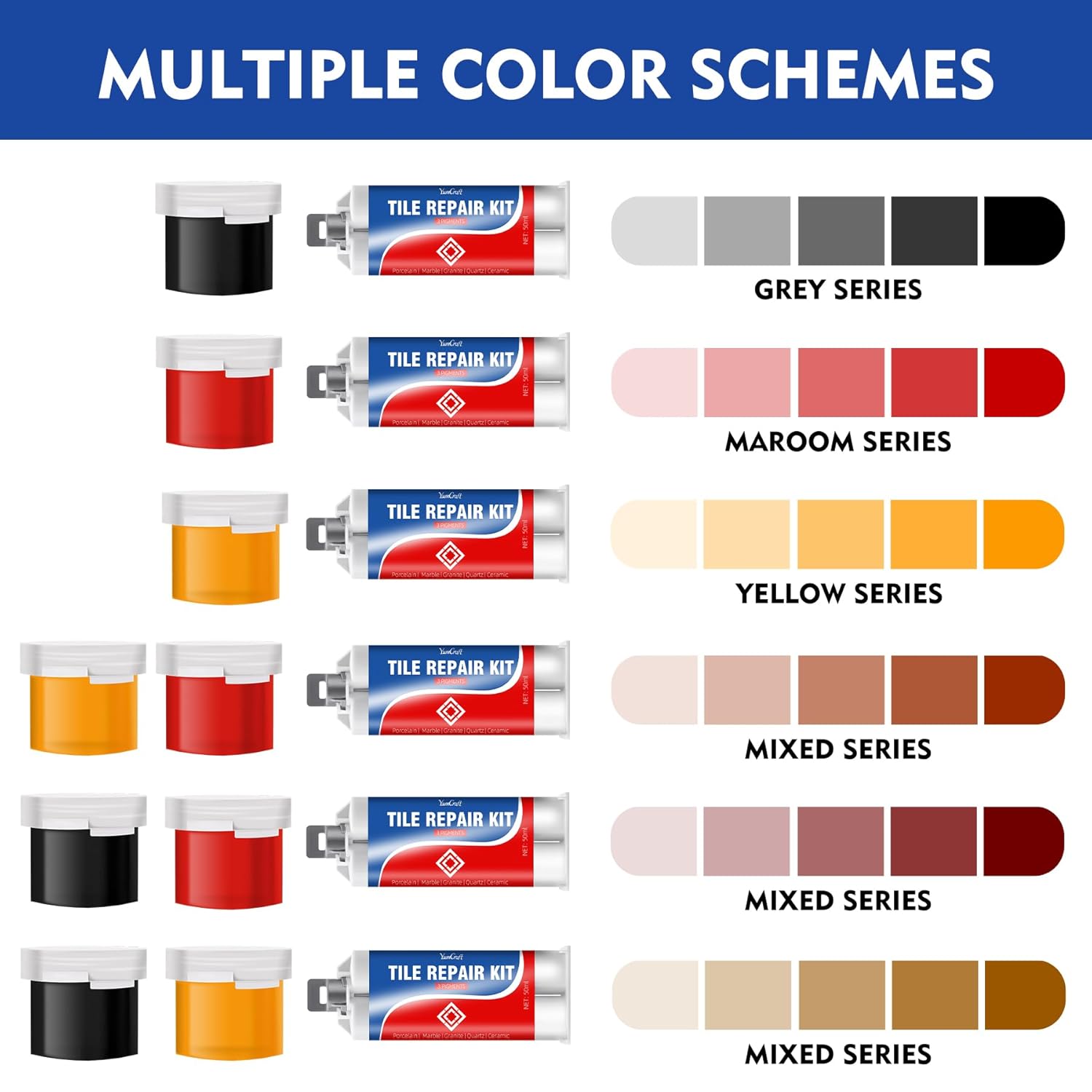 • The Kit Includes: 100ml tiles and bathtub repair kits including 2 tile repair kits, 1 Silicone Cup, 4 Stirrers, 2 Pairs of Gloves, 1 Push Rod, 2 Sandpapers, 1 Scraper, and 3 colors of paint: black, red, and yellow. After getting them, ensure that you can use them yourself without any tools.