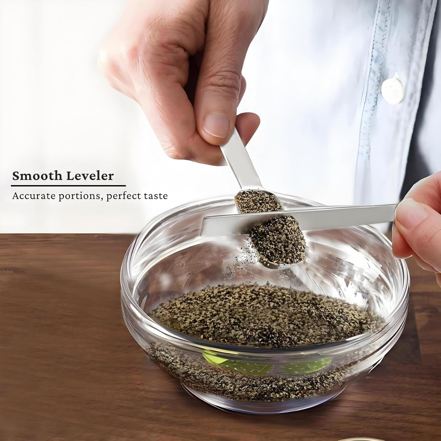 • COMPLETE 9-PIECE SET: This Measuring scooper set comes with 8 Narrow spoons (1/8, 1/4, 1/2, 3/4, 1, 2 tsp and 1 tbsp) and 1 Leveler. This complete set meets all your cooking and baking needs, saying goodbye to inaccurate portion sizes and ensuring perfect taste.