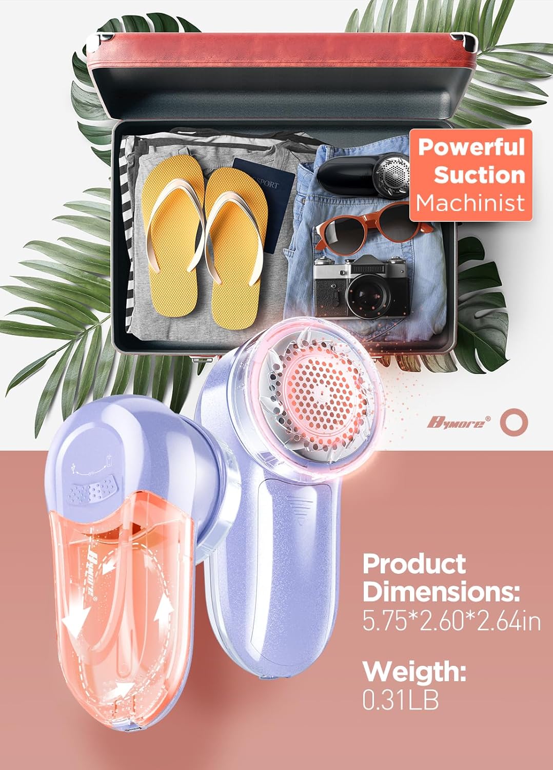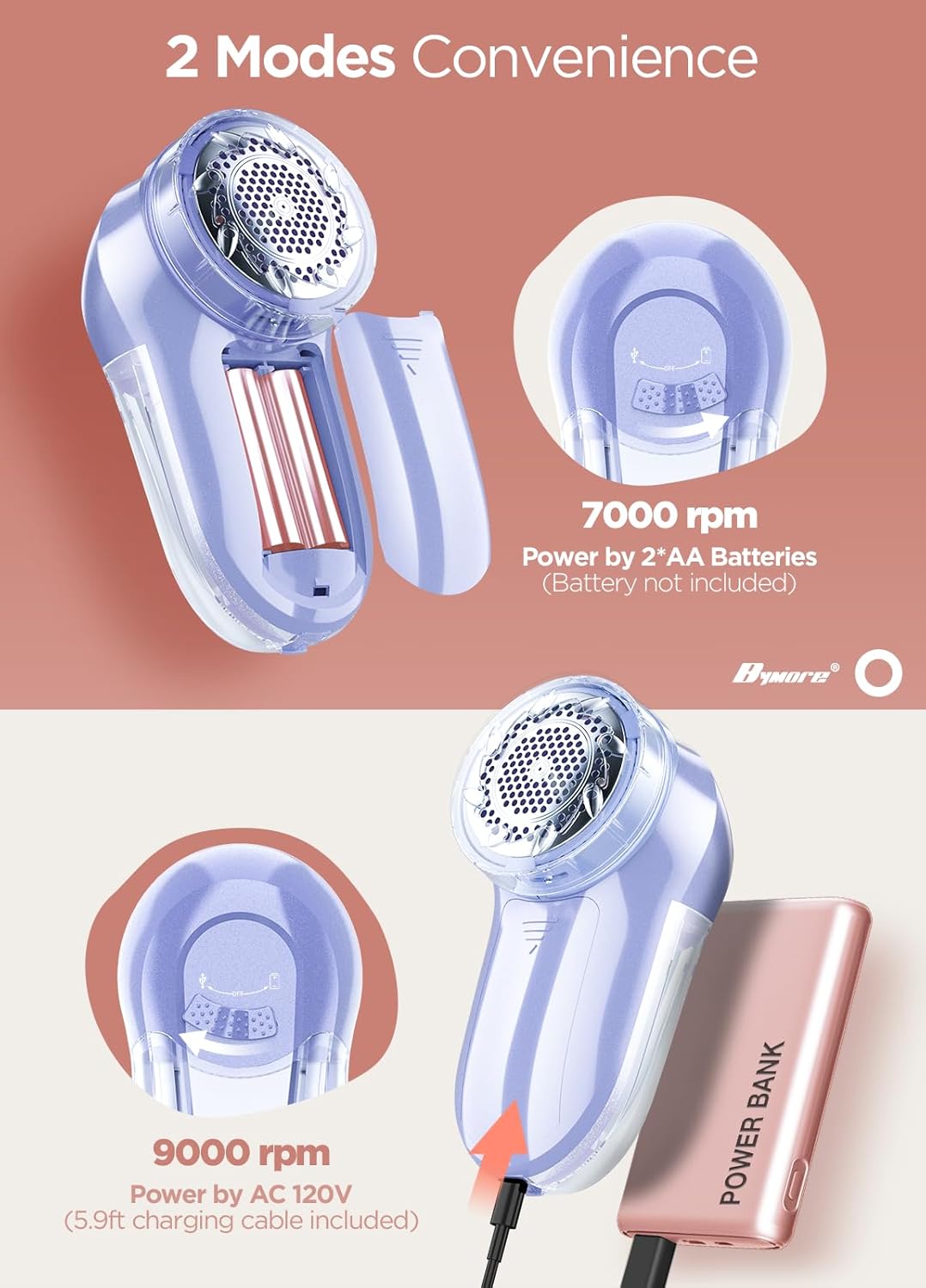 Bymore Fabric Shaver, Lint Remover, Lint Shaver Defuzzer Sweater Shaver for Clothes and Furniture AC Adapter or Battery Operated Pill Fuzz Remover-Light Purple