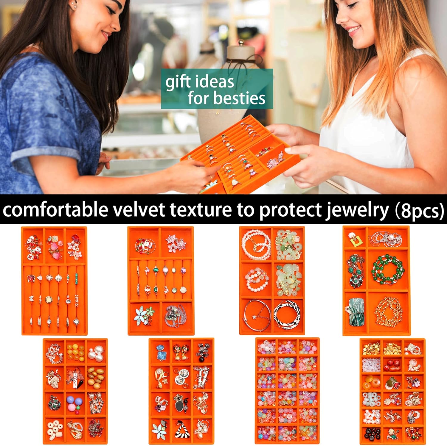 • Perfect Size for Any Drawer or Table: Set of 8 jewelry trays ( Each 8.2 " x 5 " x 1"). Convenient and roomy enough for you to store your different jewelry, like earrings,bracelets, necklaces, rings, pins, brooches,watches and so on